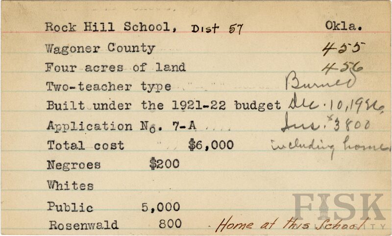 School card from Rosenwald Fund for Rock Hill School in Wagoner County, Oklahoma with handwritten notes on the card that says, "Burned Dec 19, 1926, Ins. $3,800 including home" and "Home at this school"