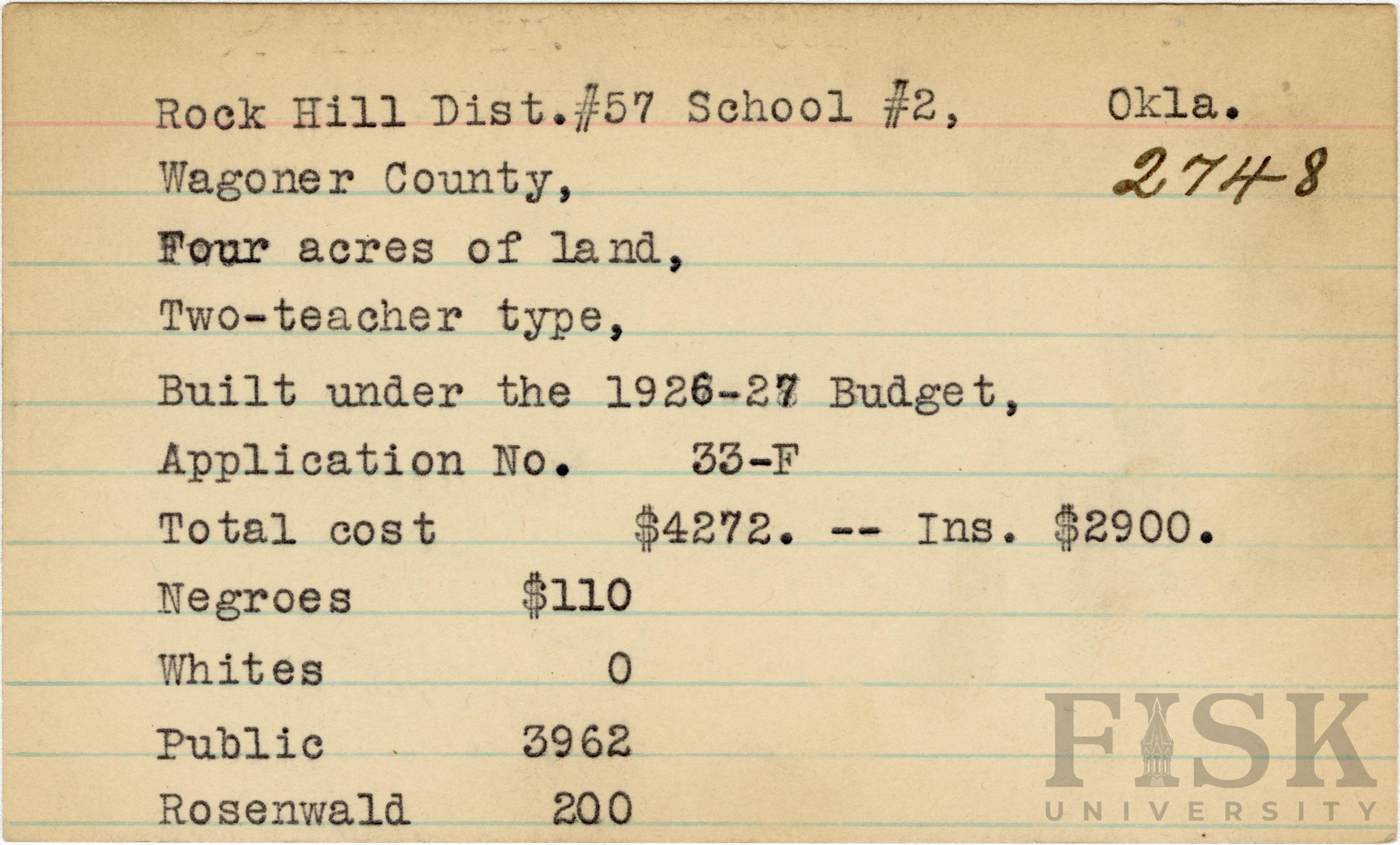- School card from Rosenwald Fund for Rock Hill Dist. No. 57 School No. 2 in Wagoner County, Oklahoma with a section added to the budget contributions that says, "Ins. $2,900"