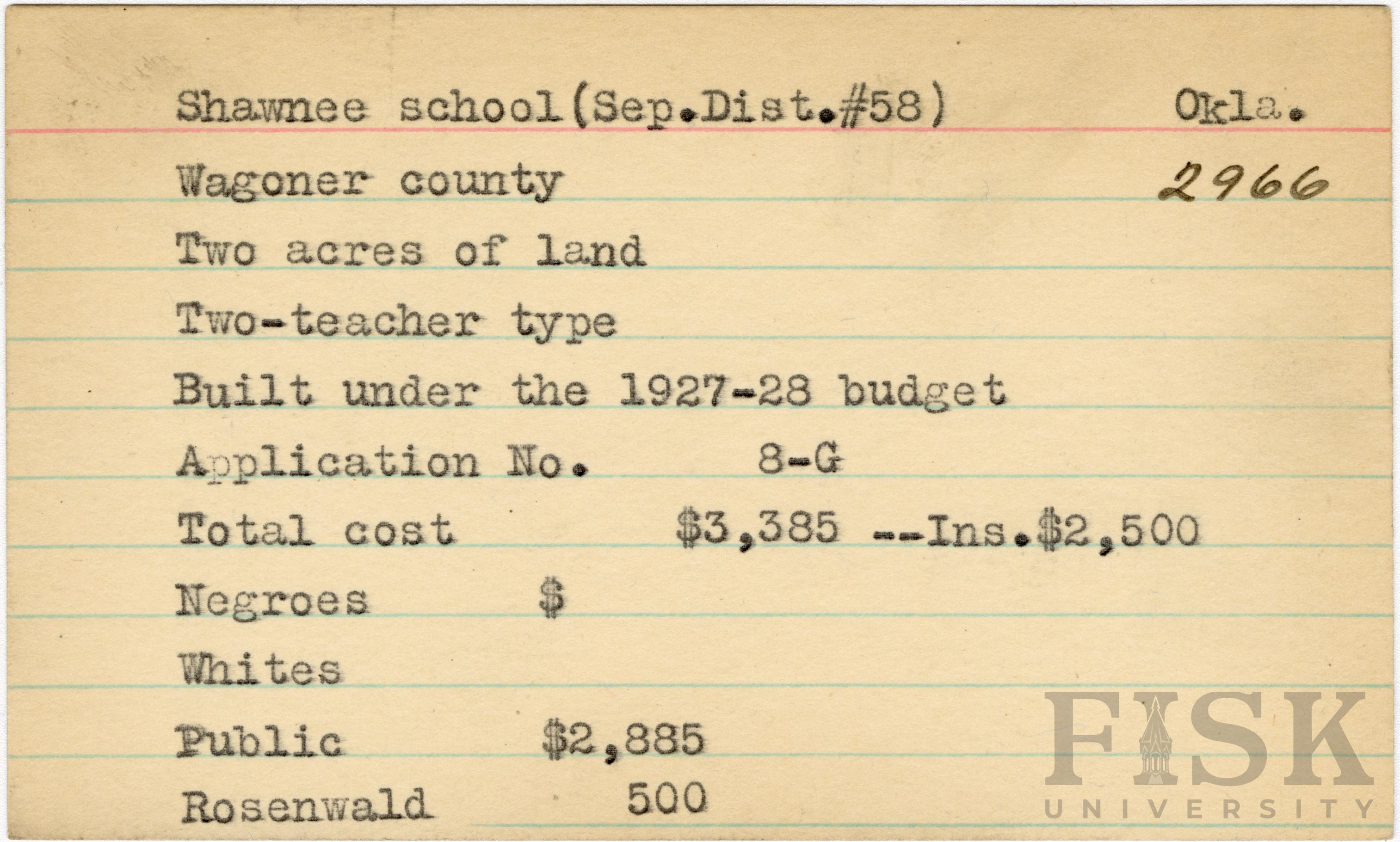 - School card from Rosenwald Fund for Shawnee School in Wagoner County, Oklahoma with a section added to the budget contributions that says, "Ins. $2,500"