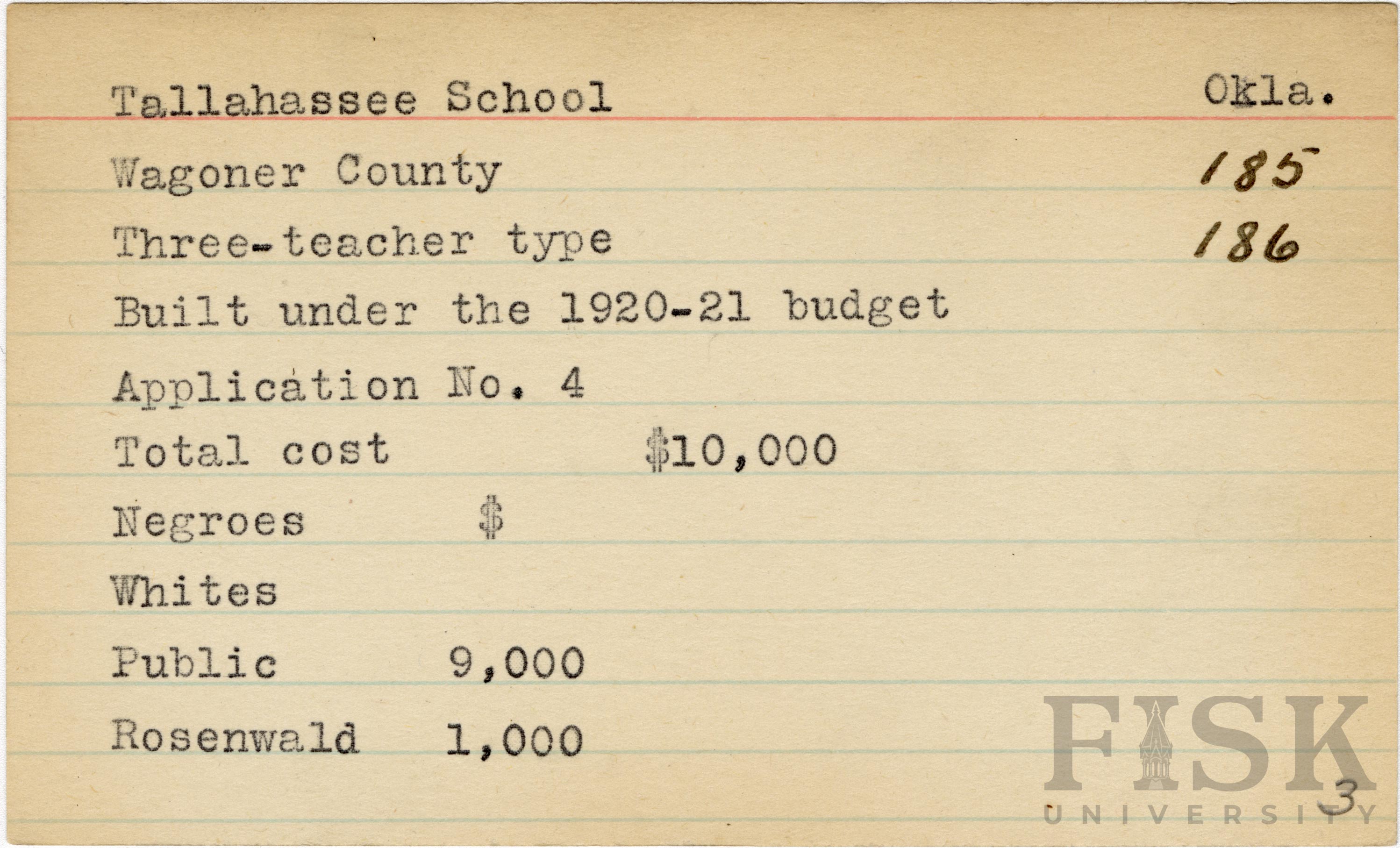 - School card from Rosenwald Fund for Tallahassee School in Wagoner County, Oklahoma