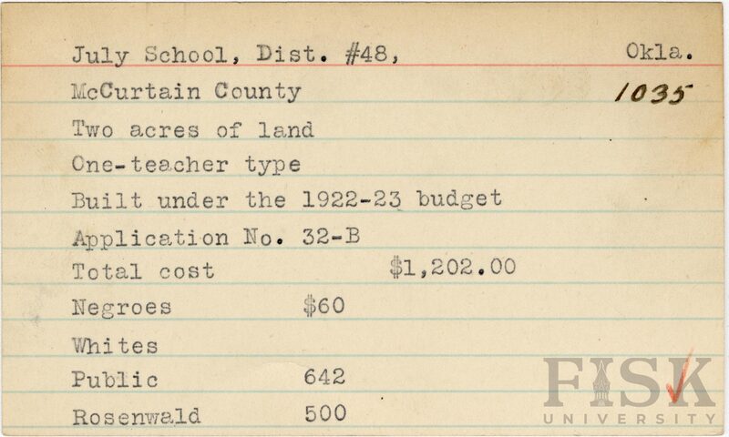 - School card from Rosenwald Fund for July School in McCurtain County, Oklahoma