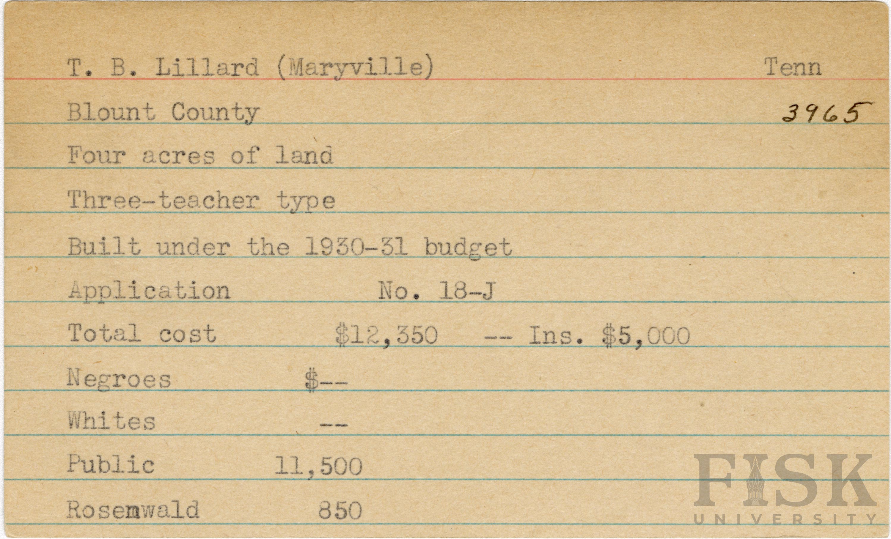 - School card from Rosenwald Fund for T. B. Lillard School in Blount County, Tennessee