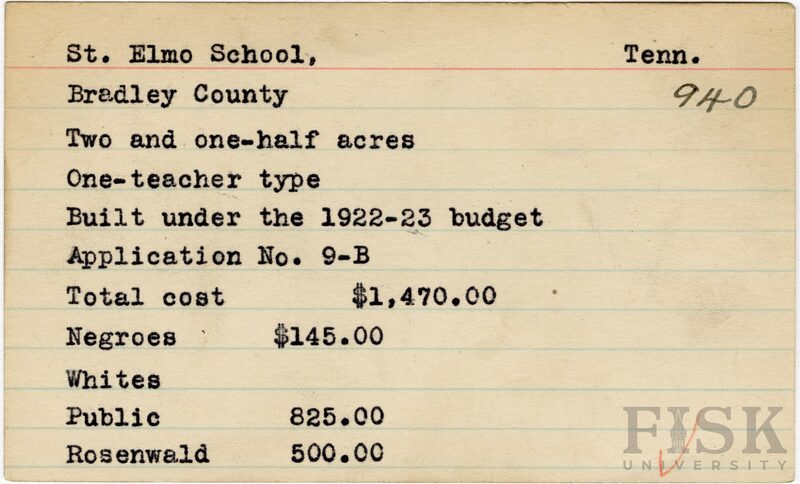 - School card from Rosenwald Fund for St. Elmo School in Bradley County, Tennessee