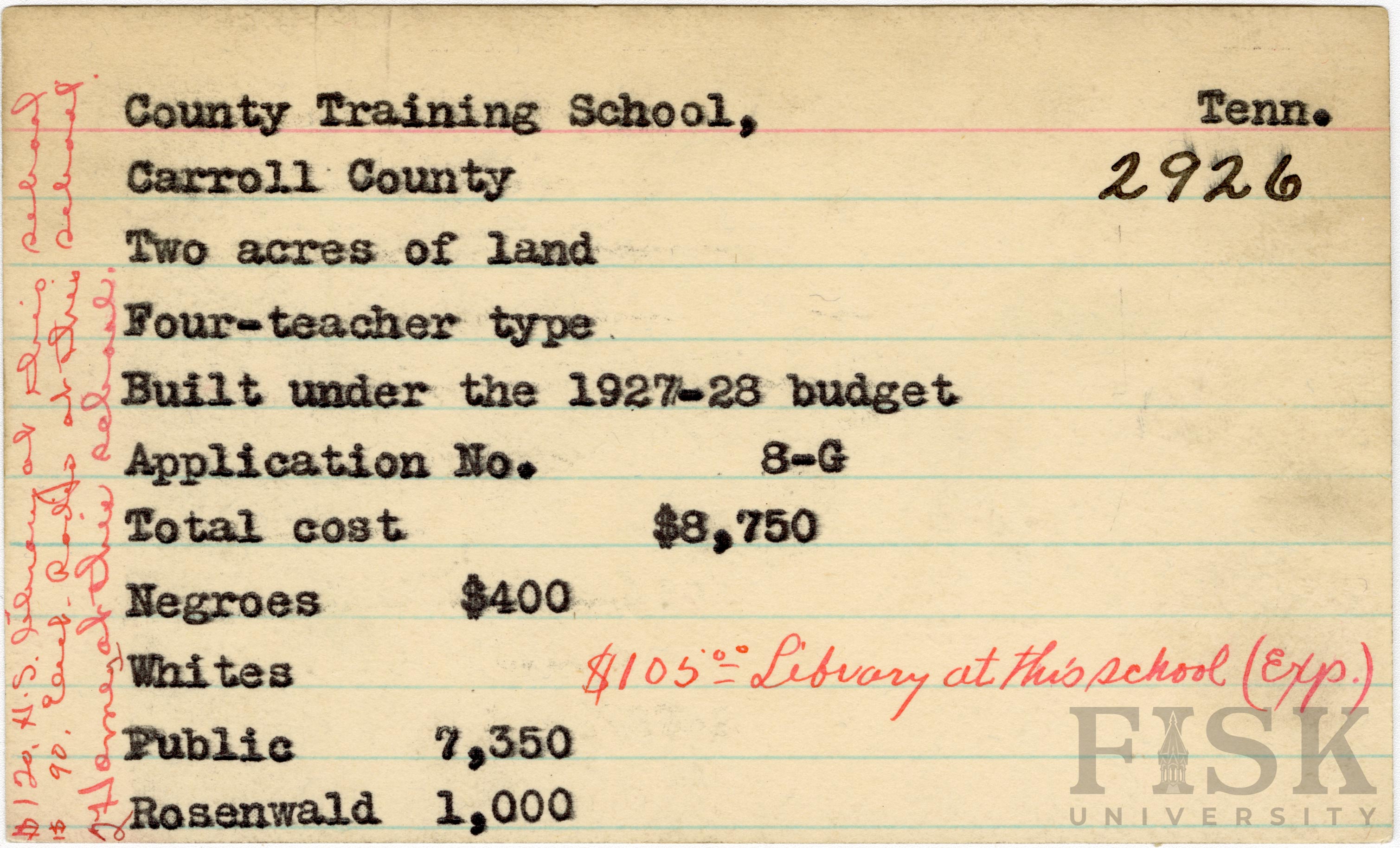 School card from Rosenwald Fund for County Training School in Carroll County, Tennessee with notes on the card that say "$120 H. S. library at this school," "$90 elec radio at this school," "home at this school," and "$105.00 library at this school (Exp)"