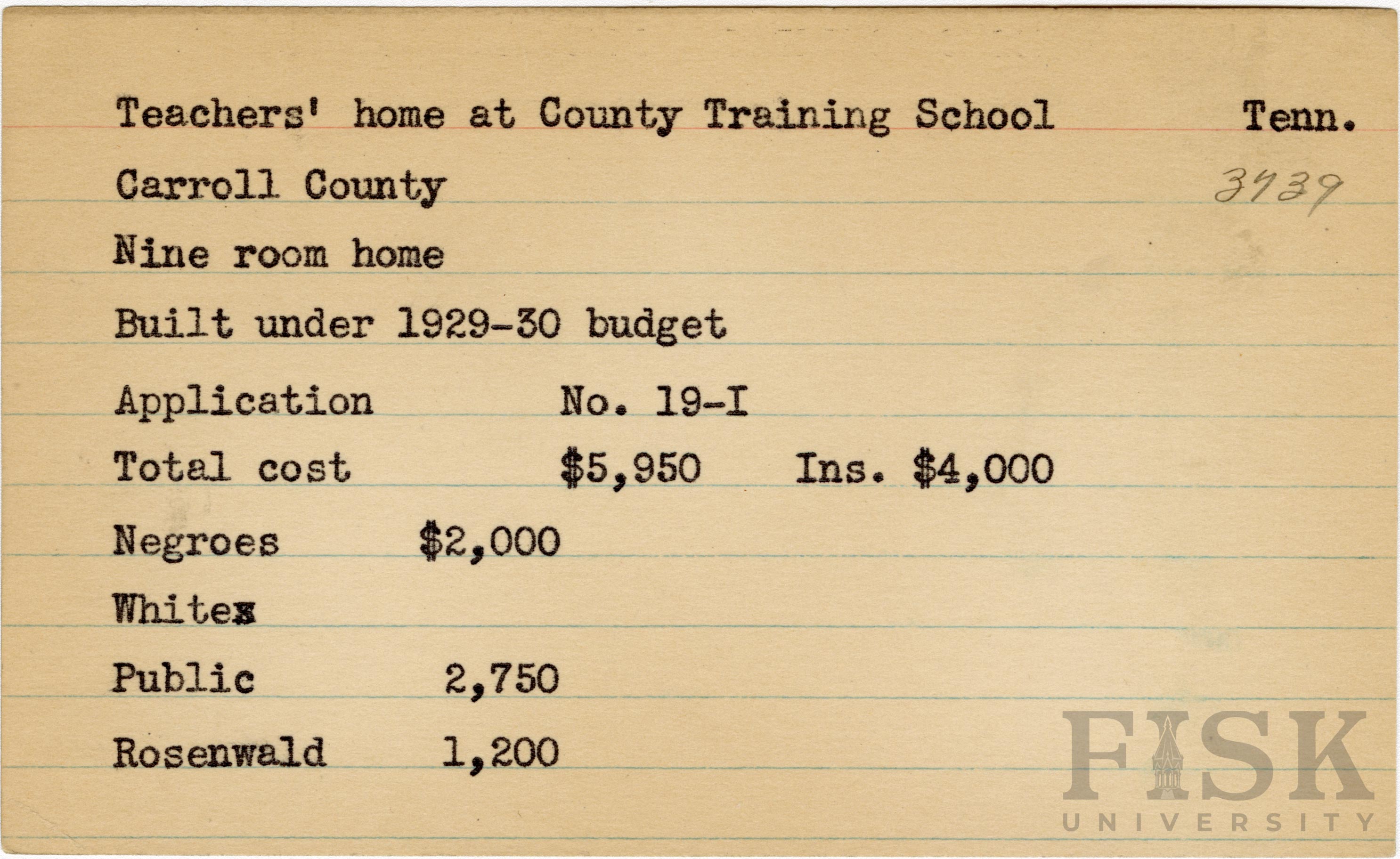 - School card from Rosenwald Fund for the nine room teacher's home at County Training School in Carroll County, Tennessee with a section added to the budget contributions that says, "Ins. $4,000"