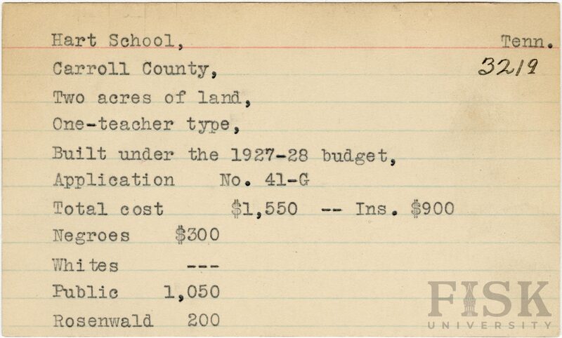 School card from Rosenwald Fund for Hart School in Carroll County, Tennessee with a section added to the budget contributions that says, "Ins. $900"