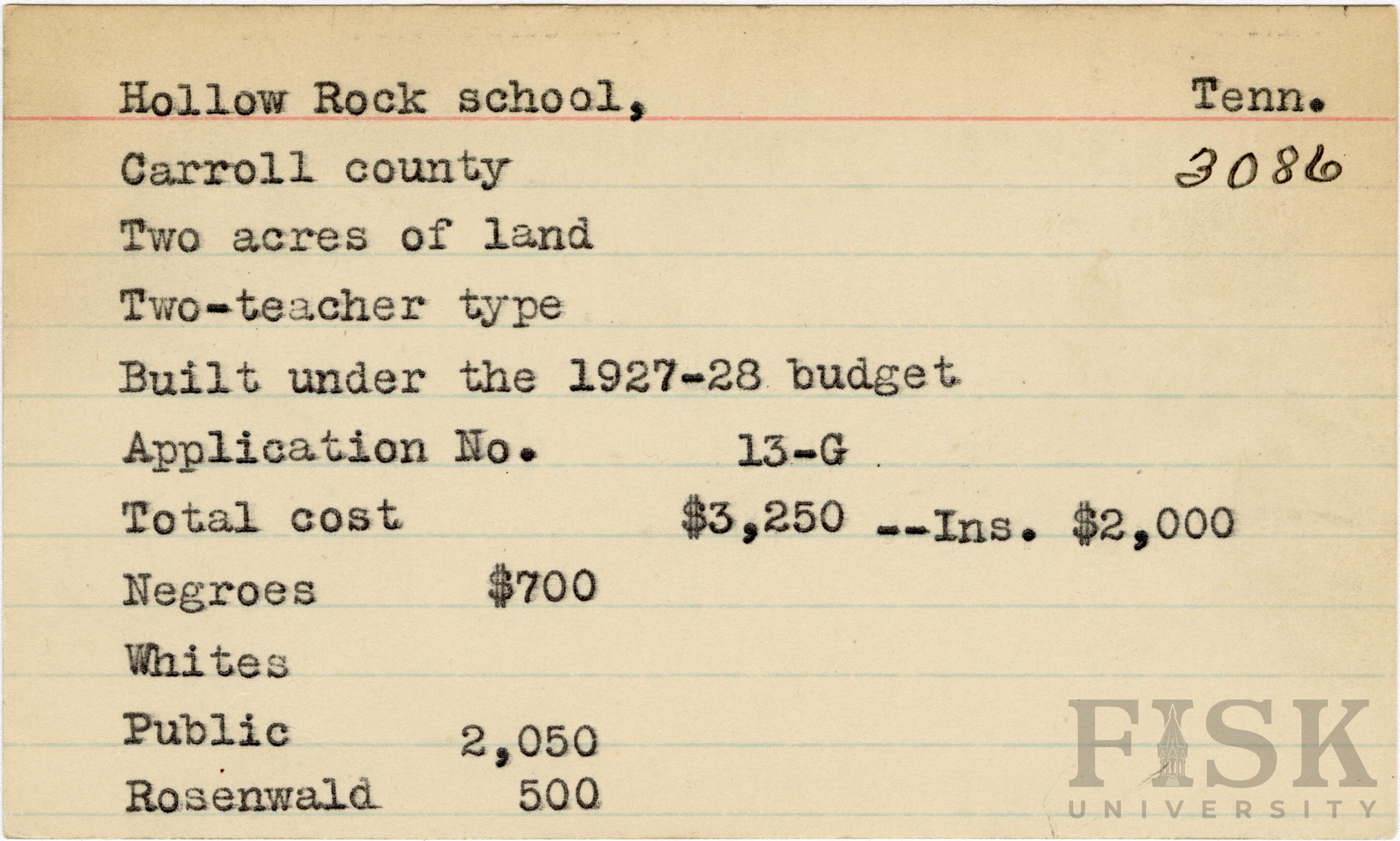 School card from Rosenwald Fund for Hollow Rock School in Carroll County, Tennessee with a section added to the budget contributions that says, "Ins. $2,000"