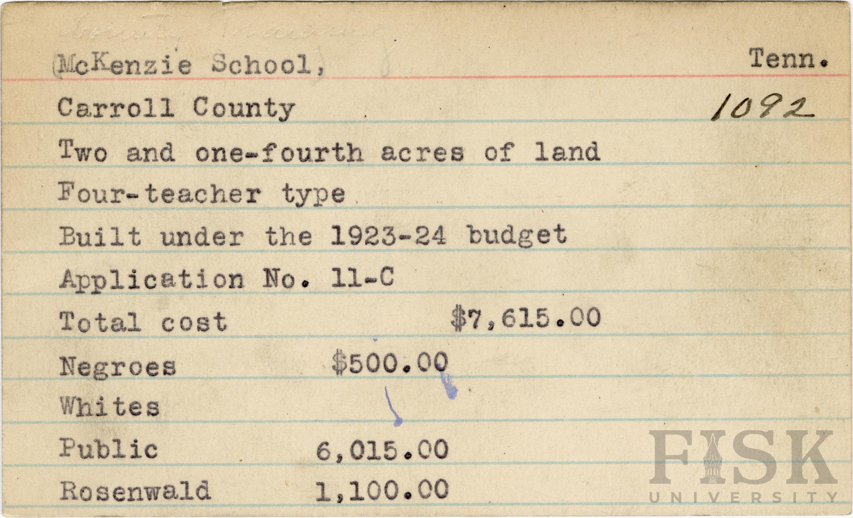 - School card from Rosenwald Fund for McKenzie School in Carroll County, Tennessee