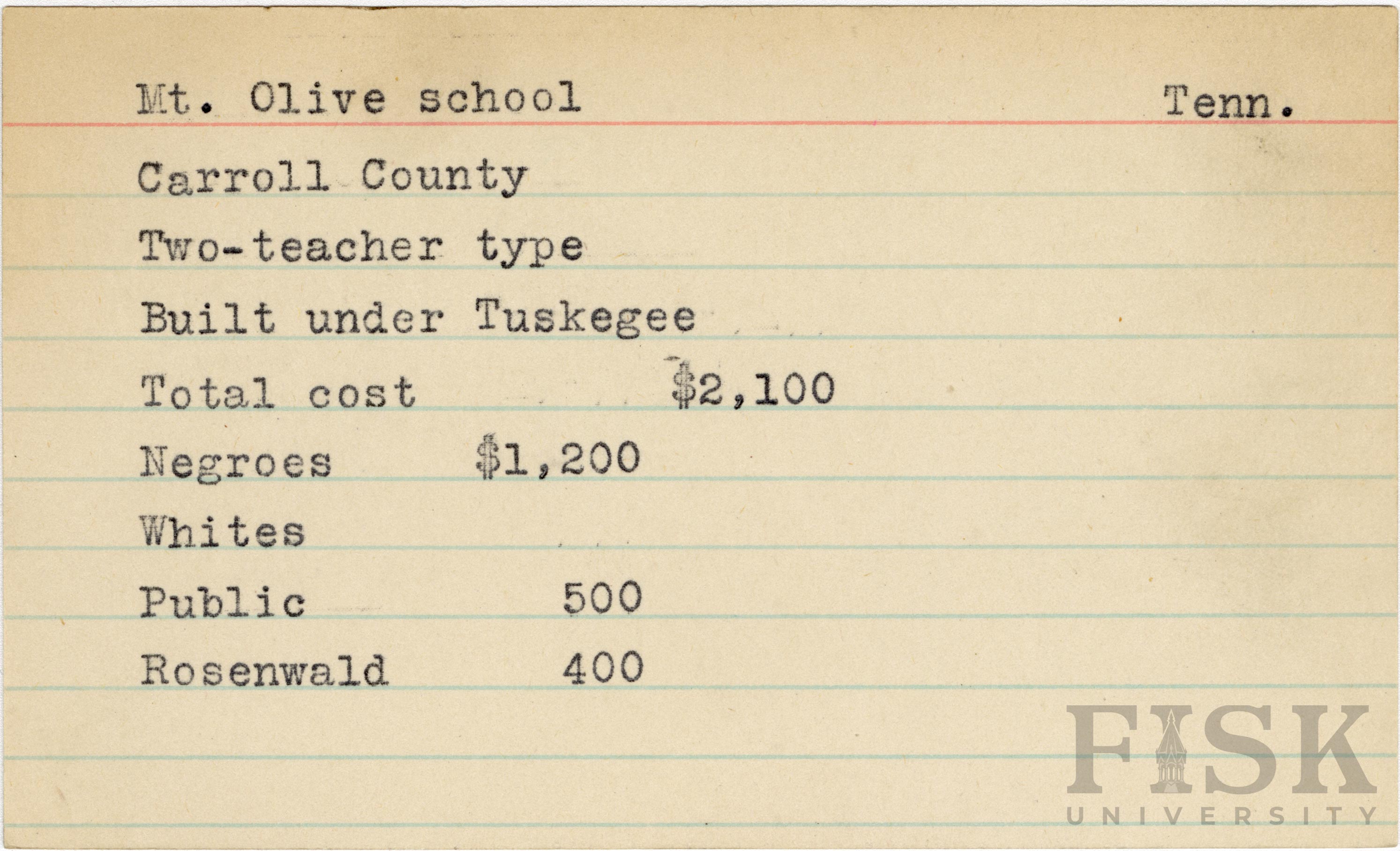 - School card from Rosenwald Fund for Mt. Olive School in Carroll County, Tennessee