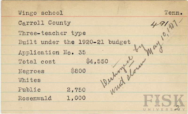 - School card from Rosenwald Fund for Wingo School in Carroll County, Tennessee with a note on the card that says, "Destroyed by wind storm May 10, 1927"