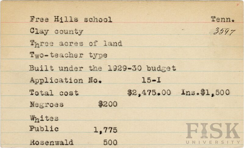 School card from Rosenwald Fund for Free Hills School in Clay County, Tennessee with a section added to the budget contributions that says, "Ins. $1,500"