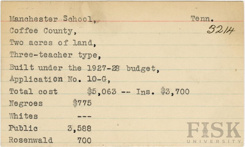 School card from Rosenwald Fund for Manchester School in Coffee County, Tennessee with a section added to the budget contributions that says, "Ins. $3,700"