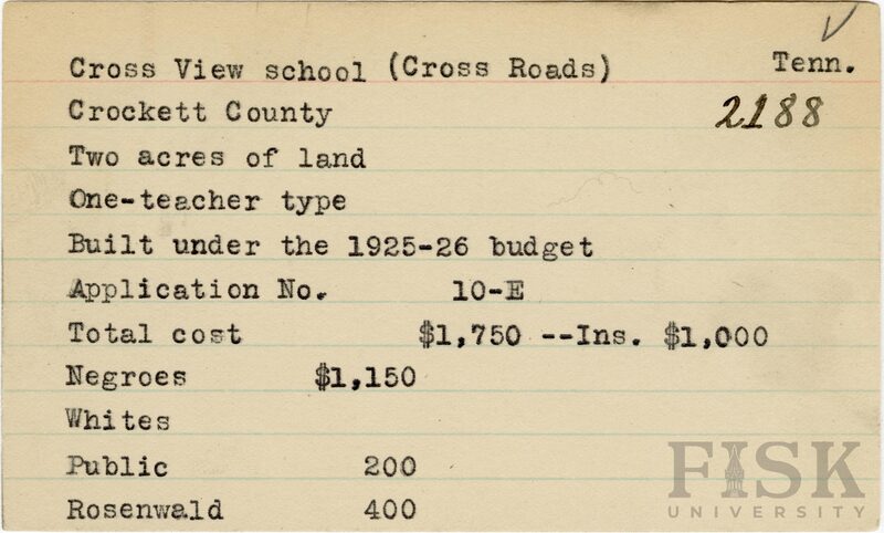 - School card from Rosenwald Fund for Cross View School in Crockett County, Tennessee with a section added to the budget contributions that says, "Ins. $1,000"