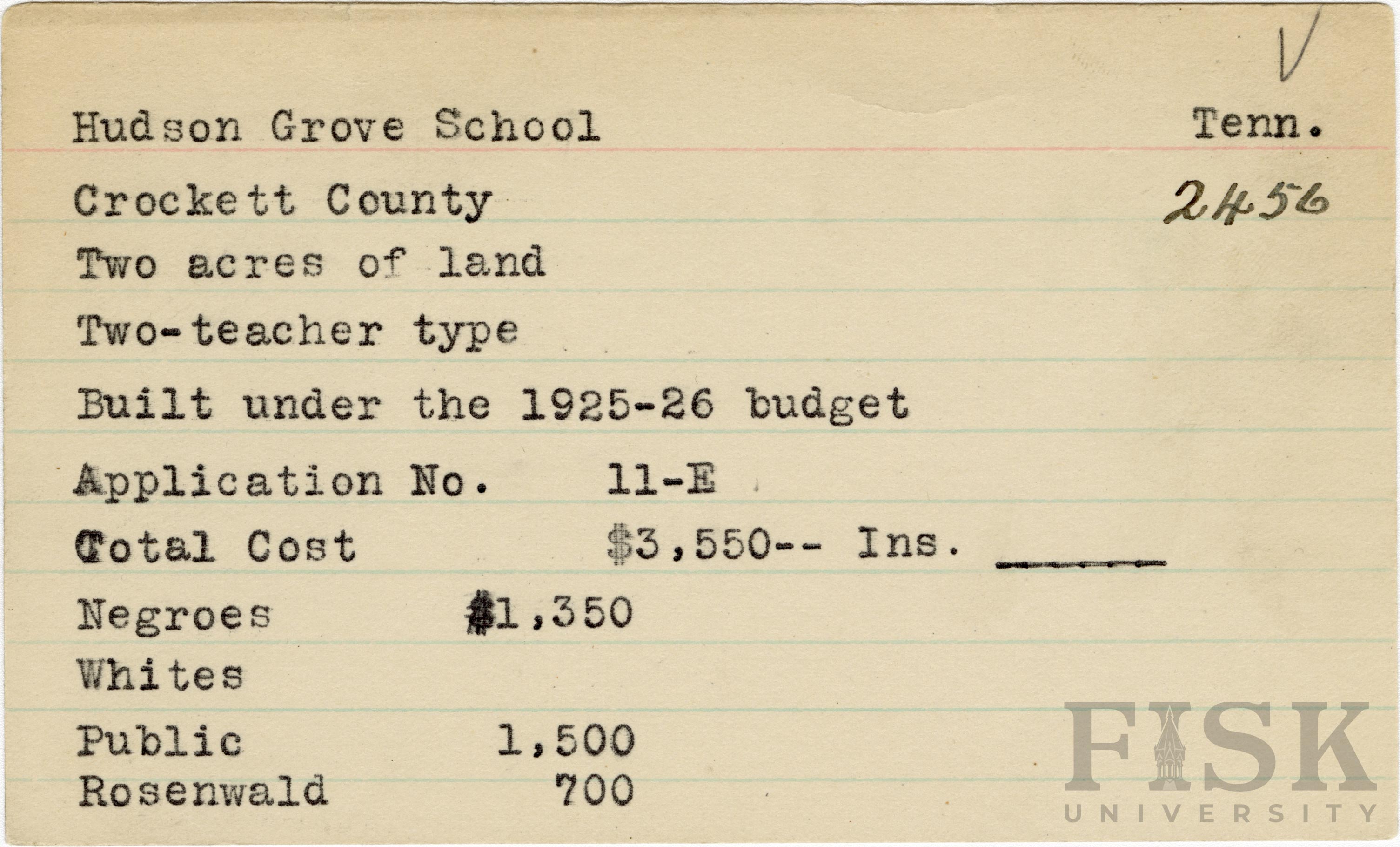 - School card from Rosenwald Fund for Hudson Grove School in Crockett County, Tennessee