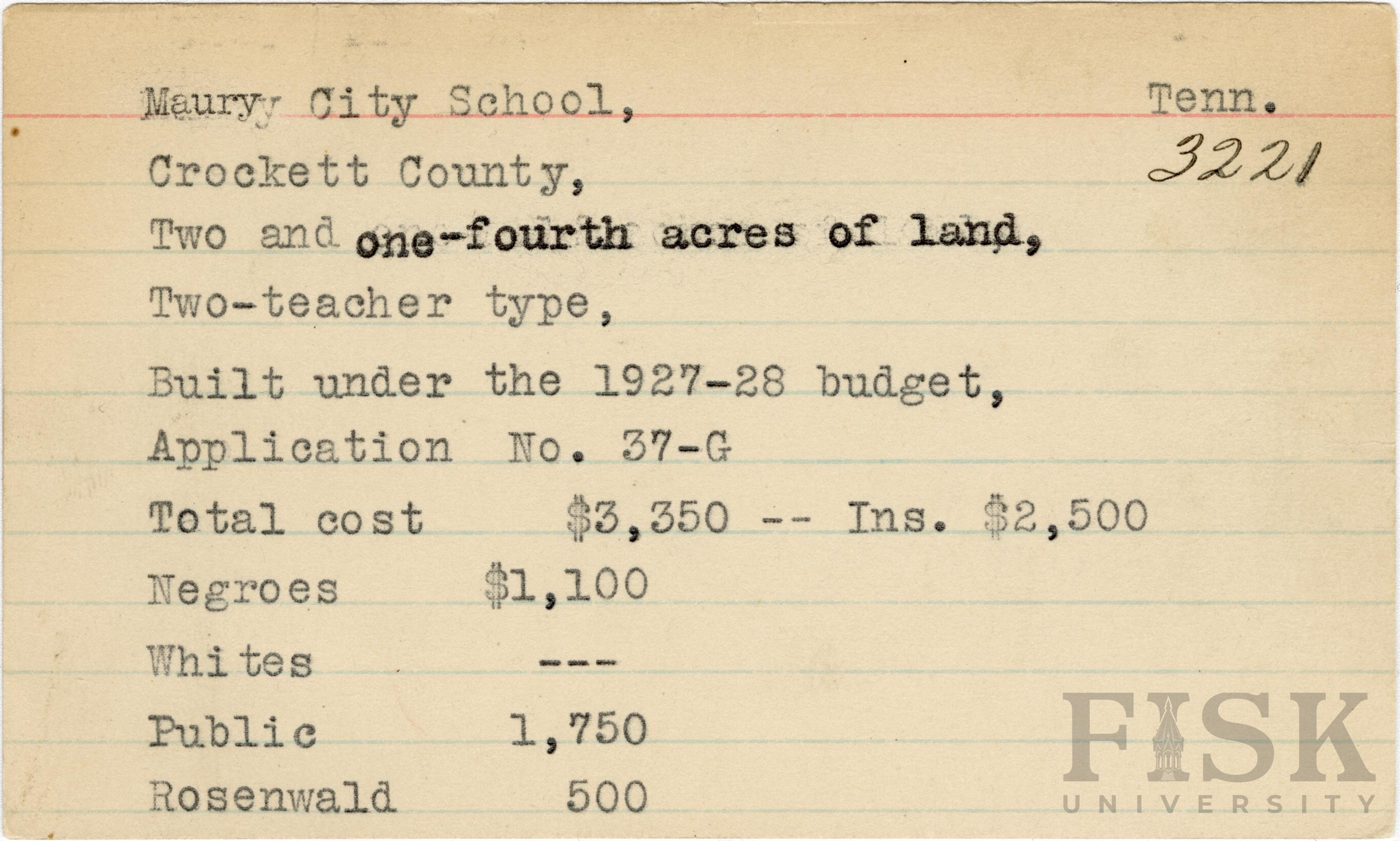 - School card from Rosenwald Fund for Maury City School in Crockett county, Tennessee with a section added to the budget contributions that says, "Ins. $2,500"