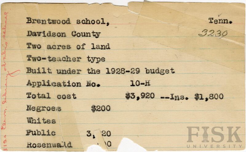 - School card from Rosenwald Fund for Brentwood School in Davidson County, Tennessee with a note on the card that says, "$120 elem library at this school"