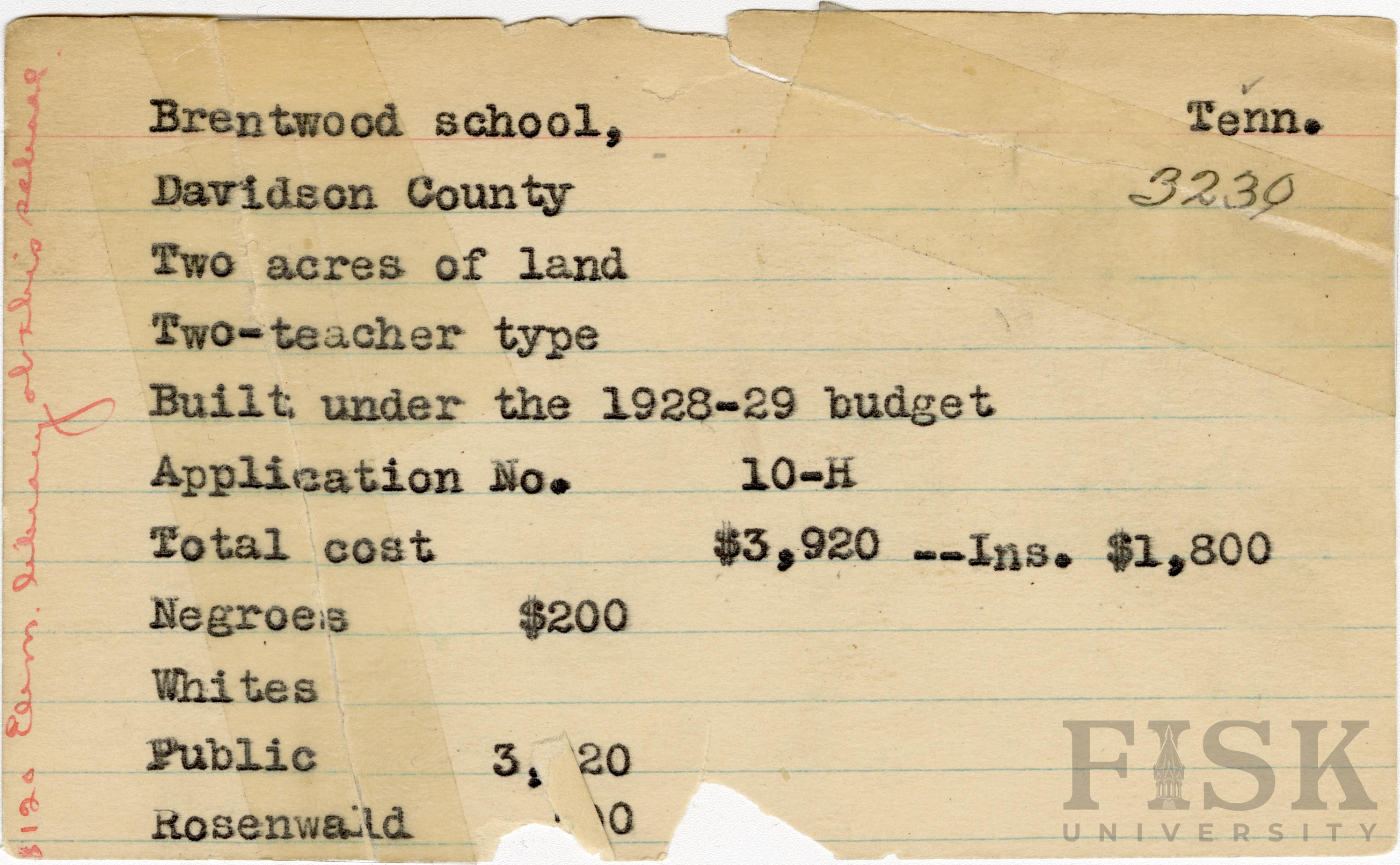 School card from Rosenwald Fund for Brentwood School in Davidson County, Tennessee with a note on the card that says, "$120 elem library at this school"