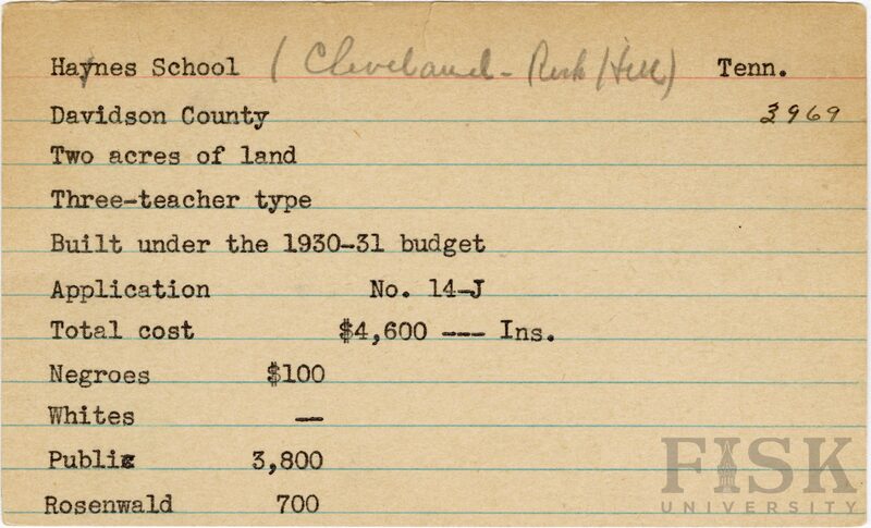 - School card from Rosenwald Fund for Haynes School in Davidson County, Tennessee