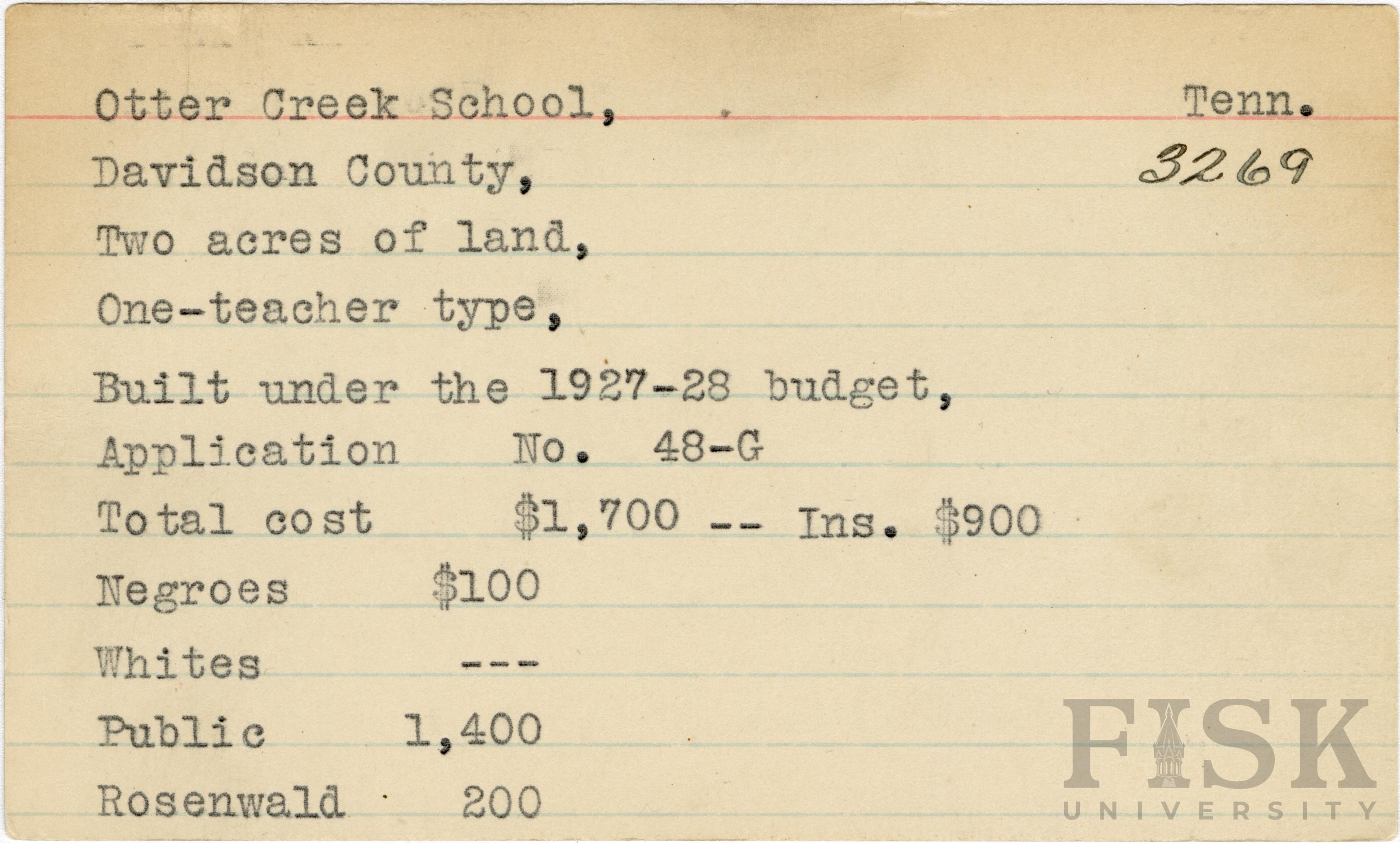 - School card from Rosenwald Fund for Otter Creek School in Davidson County, Tennessee with a section added to the budget contributions that says, "Ins. $900"
