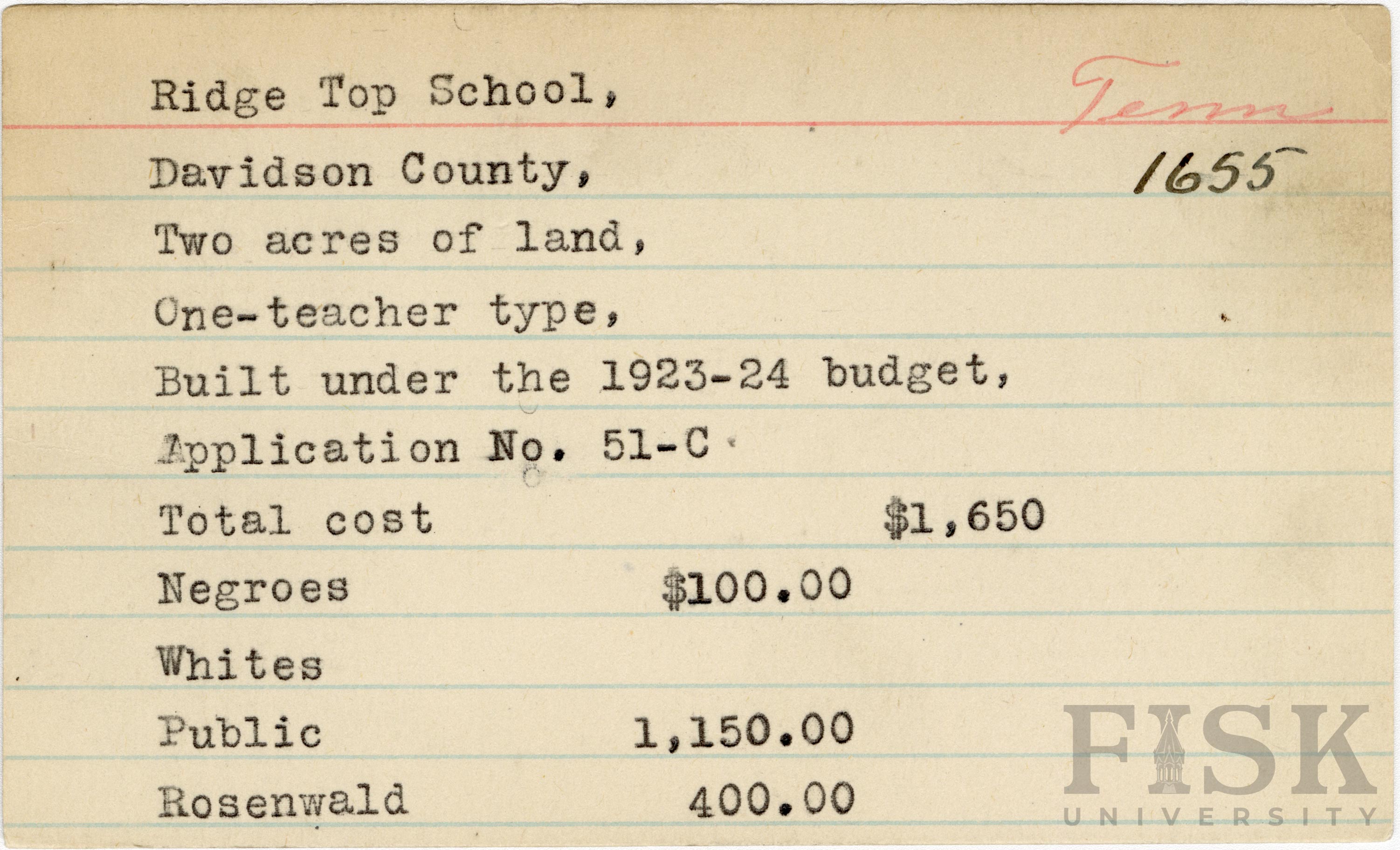 School card from Rosenwald Fund for Ridge Top School in Davidson County, Tennessee
