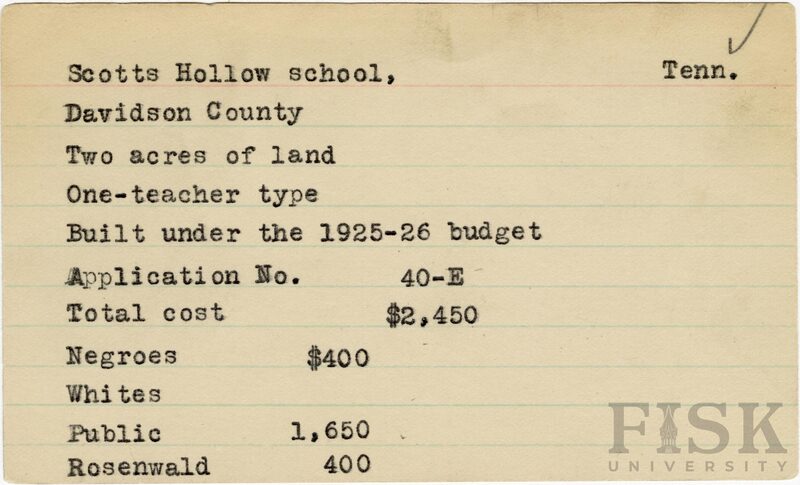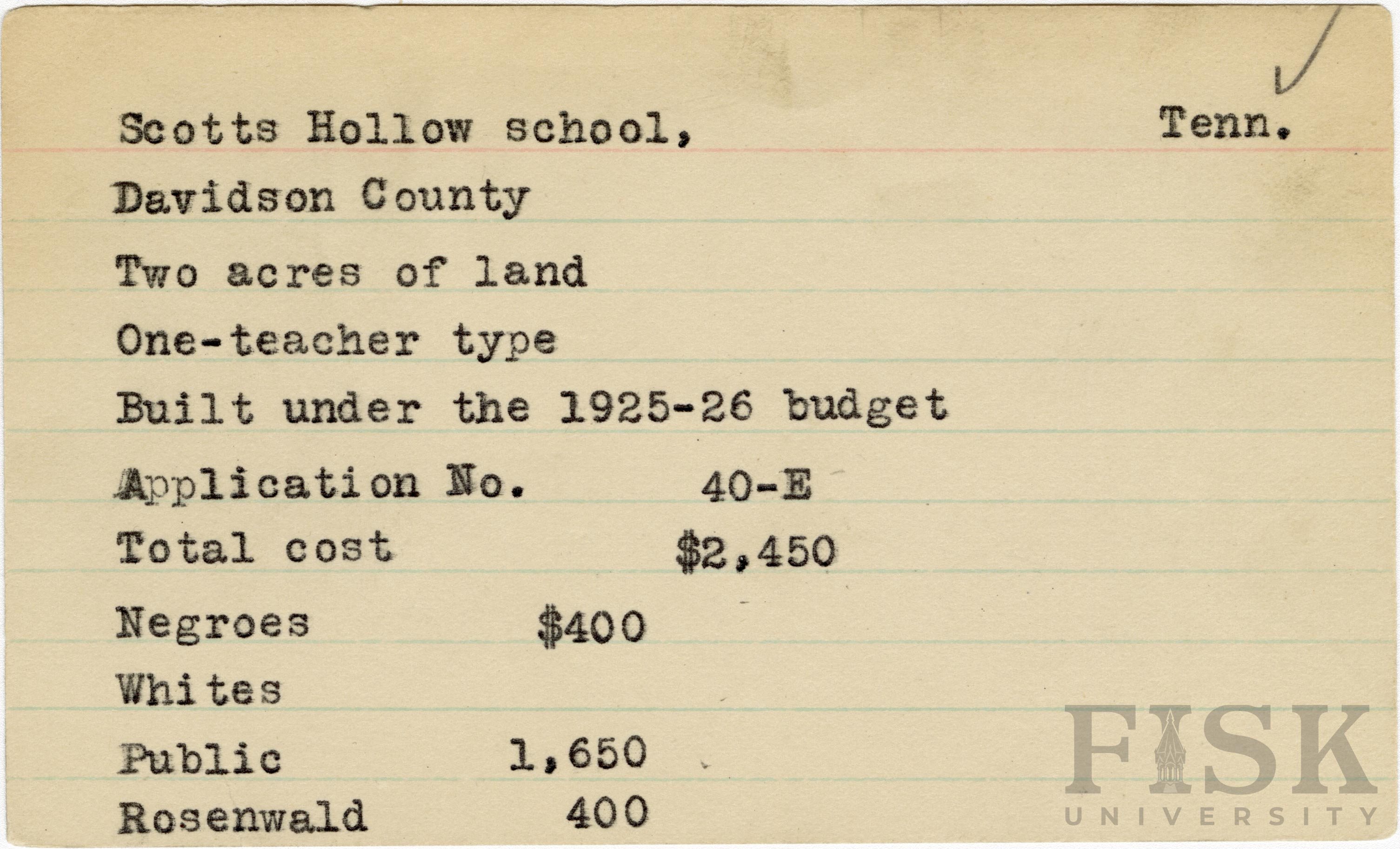 - School card from Rosenwald Fund for Scotts Hollow School in Davidson County, Tennessee