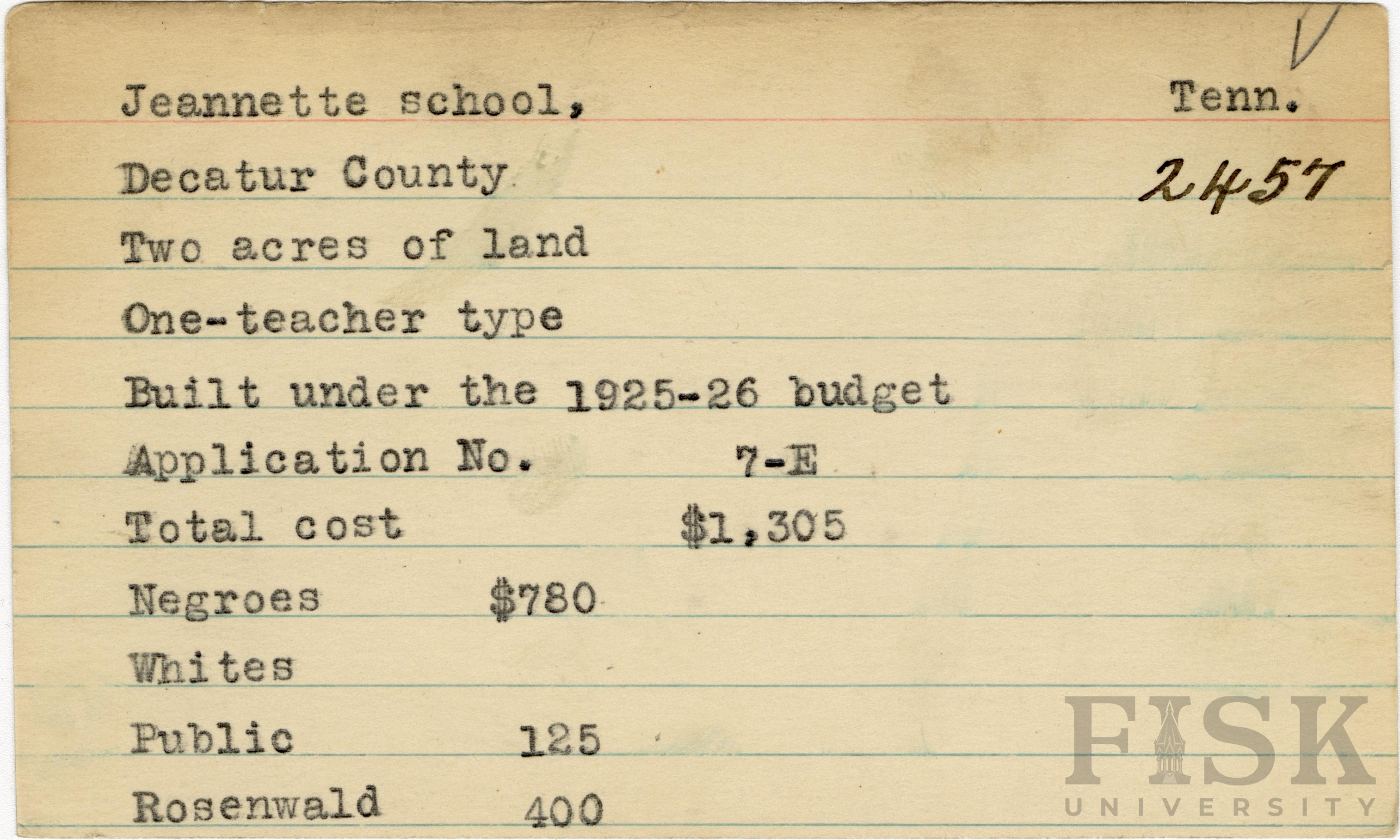 - School card from Rosenwald Fund for Jeannette School in Decatur County, Tennessee