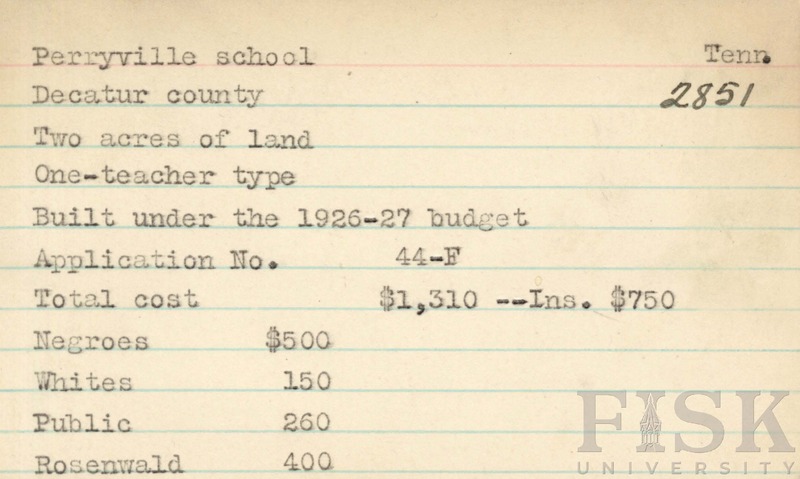 - School card from Rosenwald Fund for Perryville School in Decatur County, Tennessee with a section added to the budget contributions that says, "Ins. $750"