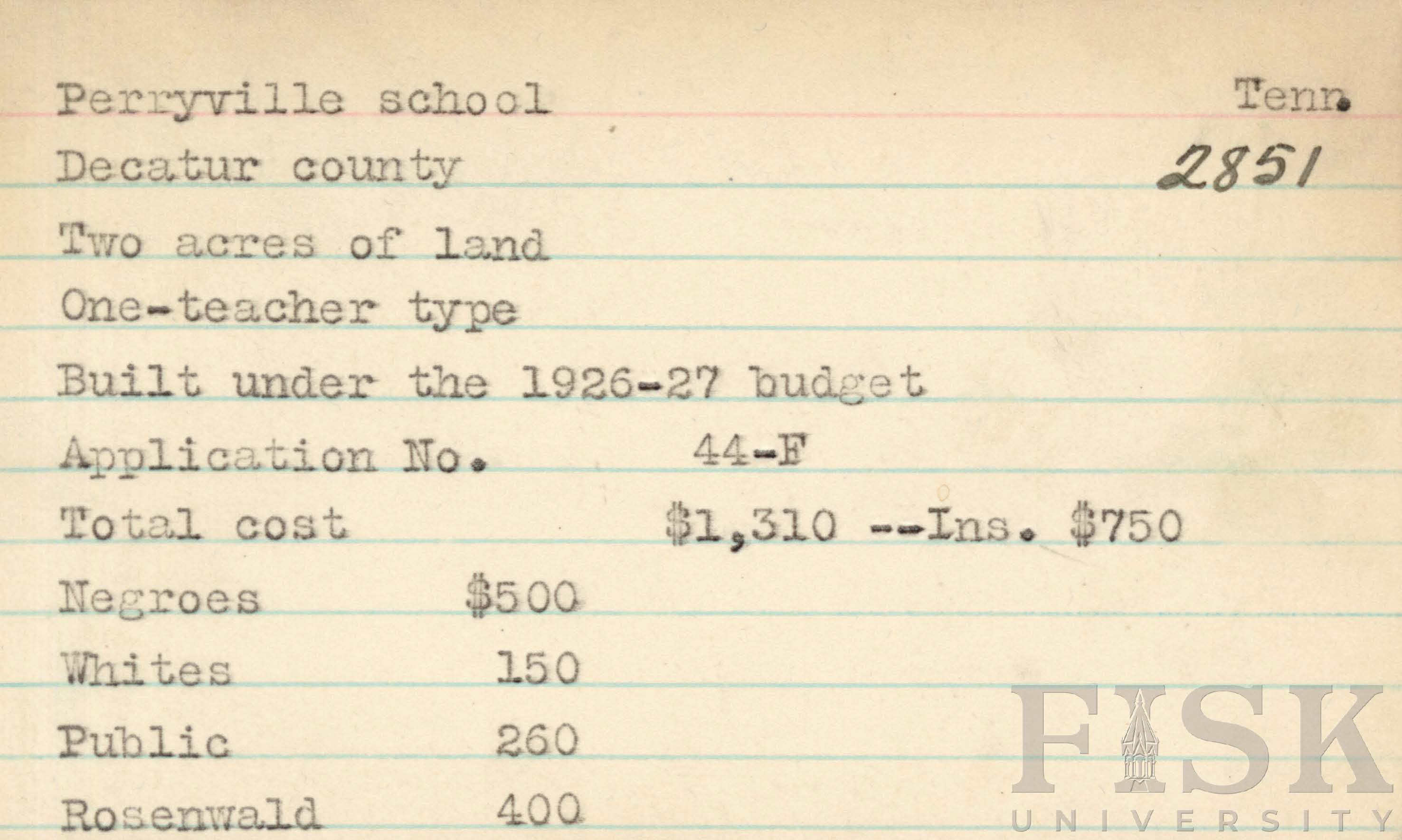 School card from Rosenwald Fund for Perryville School in Decatur County, Tennessee with a section added to the budget contributions that says, "Ins. $750"