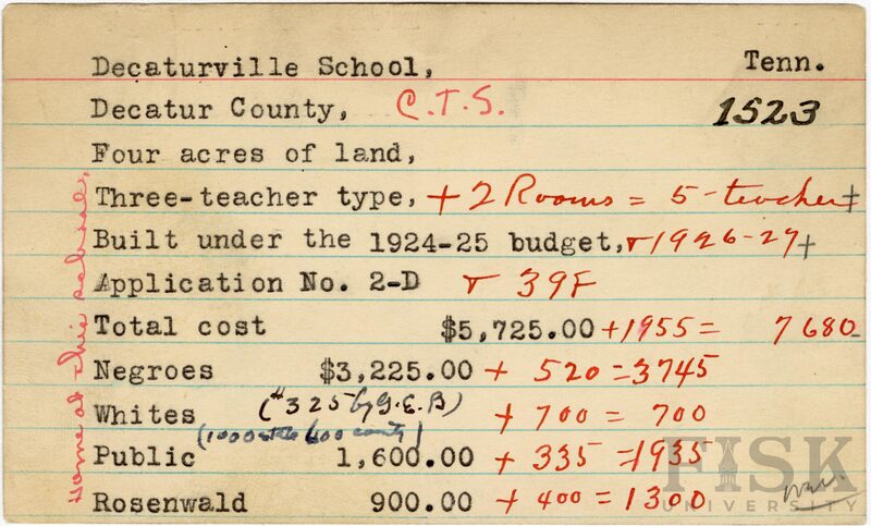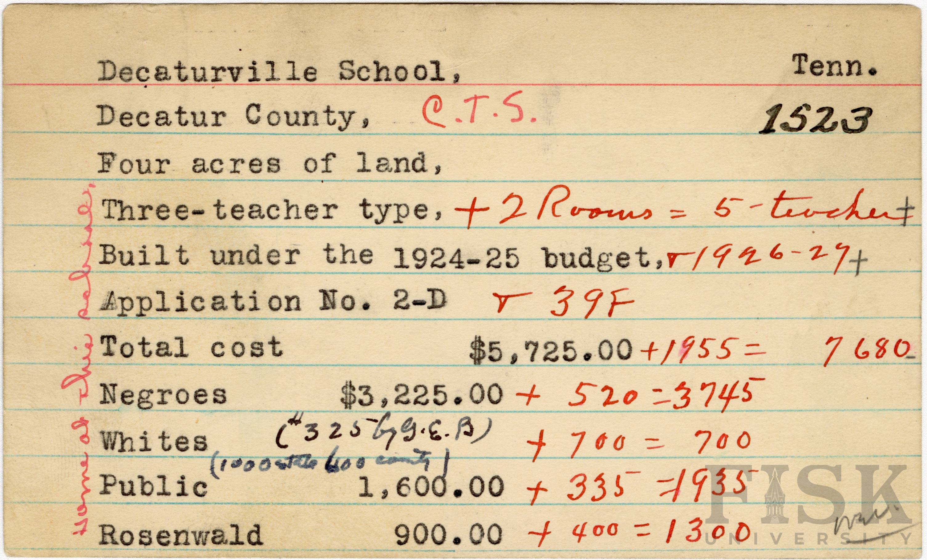 - School card from Rosenwald Fund for Decatursville School in Decatur County, Tennessee with handwritten additions to the teacher type, budget year, application number, and budget contribution sections. A note on the card says, "Home at this school" and additional budget contributions by "G.E.B." for $325 and $300