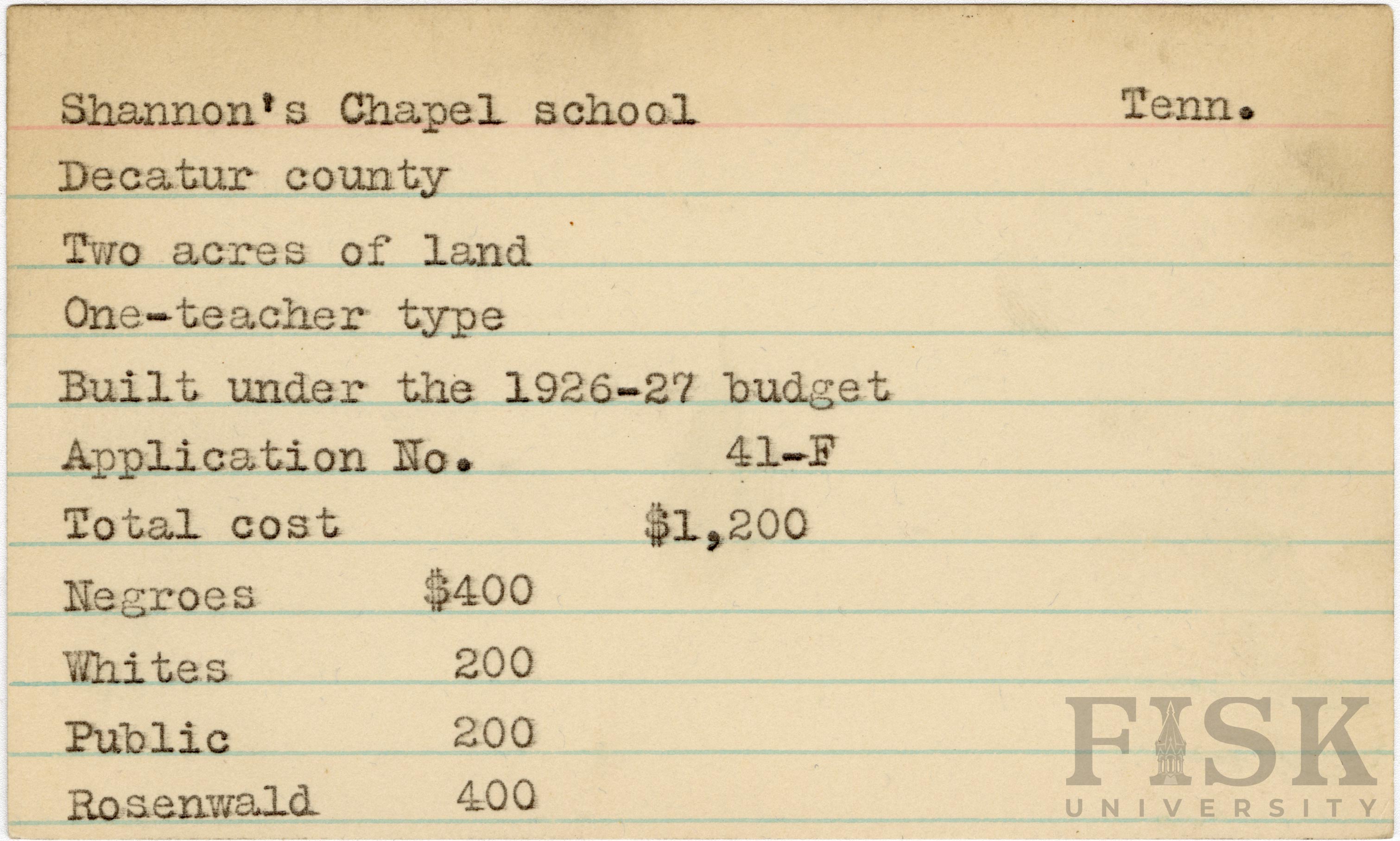 - School card from Rosenwald Fund for Shannon's Chapel School in Decatur County, Tennessee