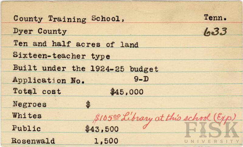 - School card from Rosenwald Fund for County Training School in Dyer County, Tennessee with a note on the card that says, "$105.00 library at this school (Exp)"