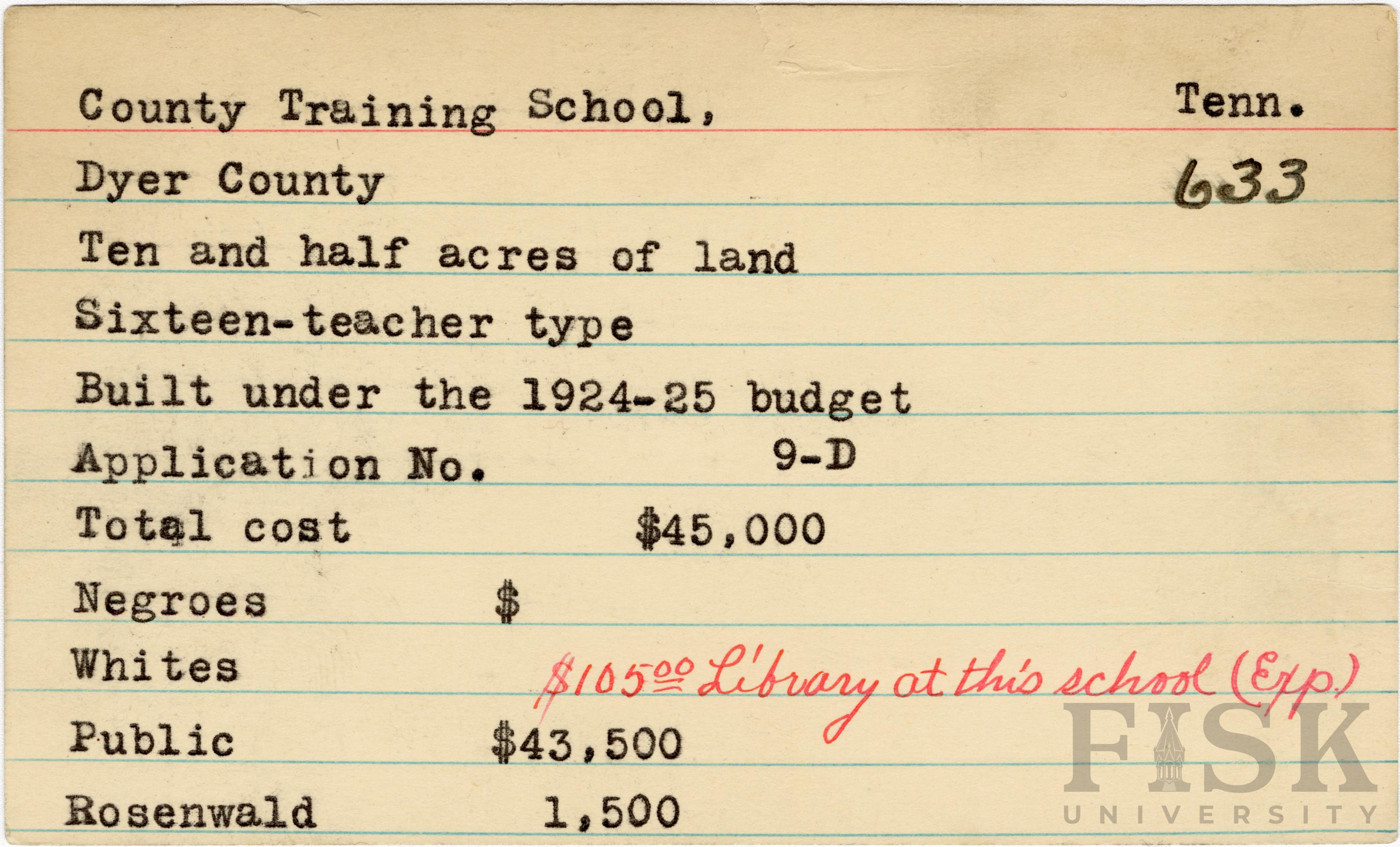 School card from Rosenwald Fund for County Training School in Dyer County, Tennessee with a note on the card that says, "$105.00 library at this school (Exp)"