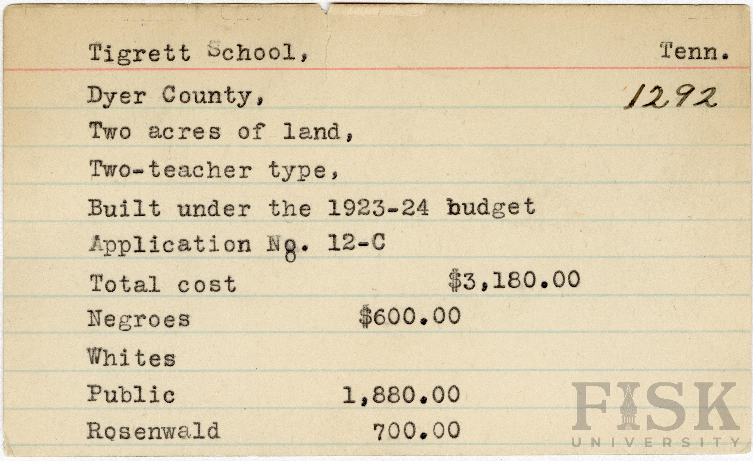 - School card from Rosenwald Fund for Tigrett School in Dyer County, Tennessee