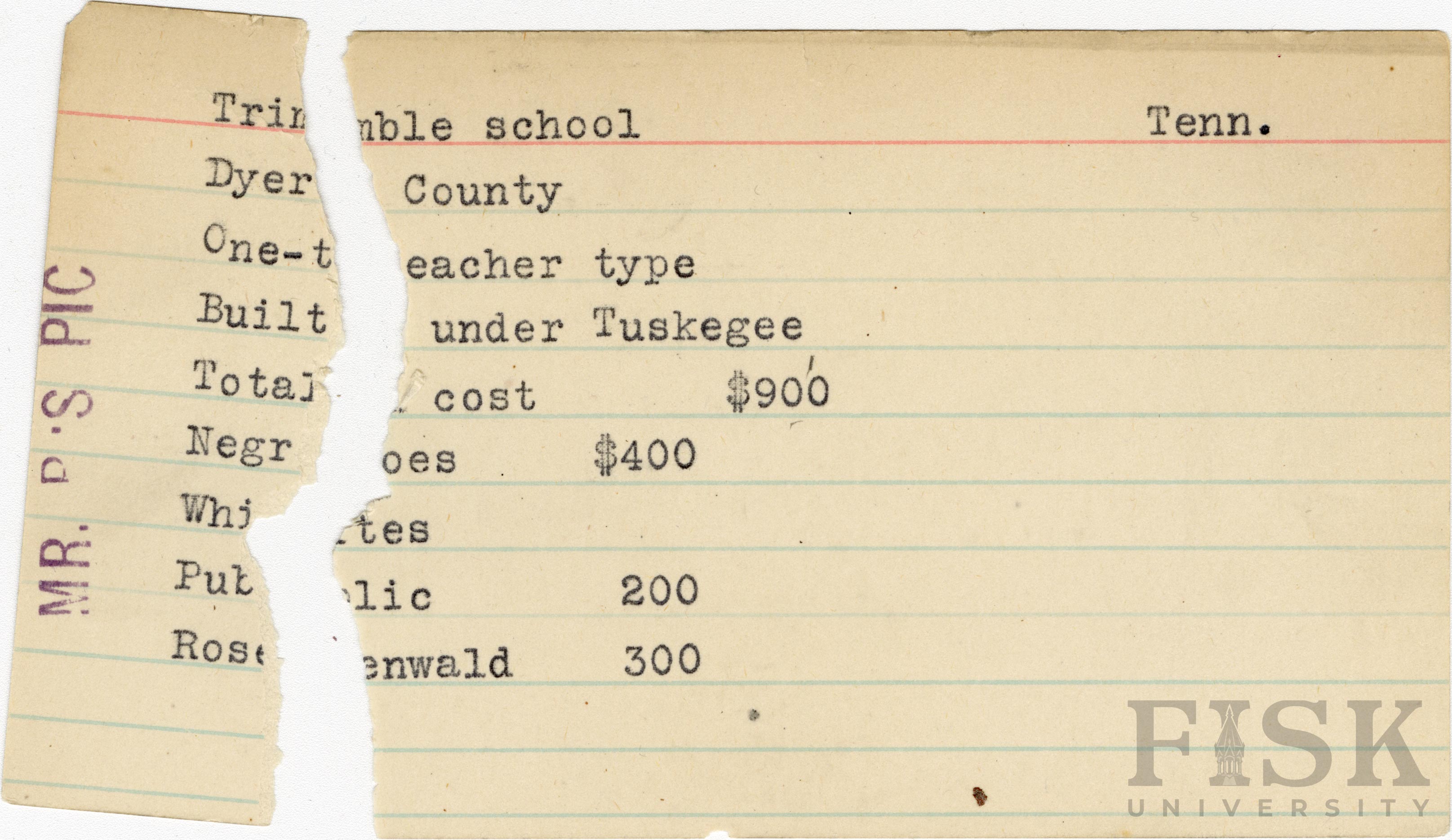 - School card from Rosenwald Fund for Trimble School in Dyer County, Tennessee with a note on the card that says, "Mr. R's Pic"