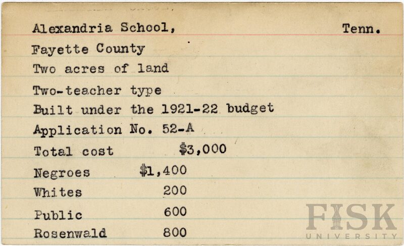- School card from Rosenwald Fund for Alexandria School in Fayette County, Tennessee