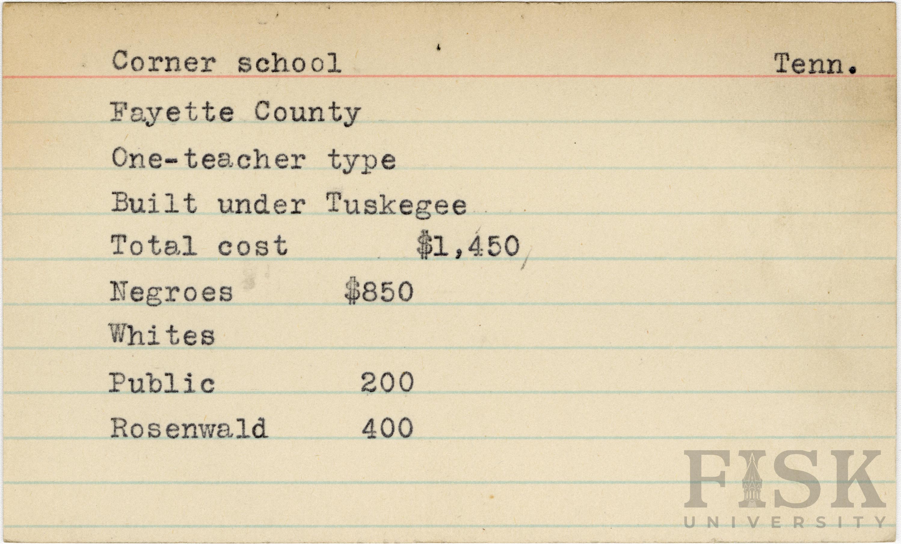 - School card from Rosenwald Fund for Corner School in Fayette County, Tennessee