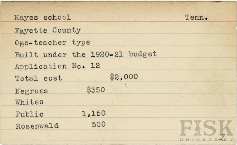 - School card from Rosenwald Fund for Hayes School in Fayette County, Tennessee