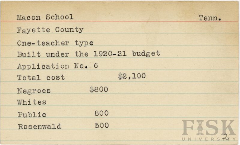 - School card from Rosenwald Fund for Macon School in Fayette County, Tennessee