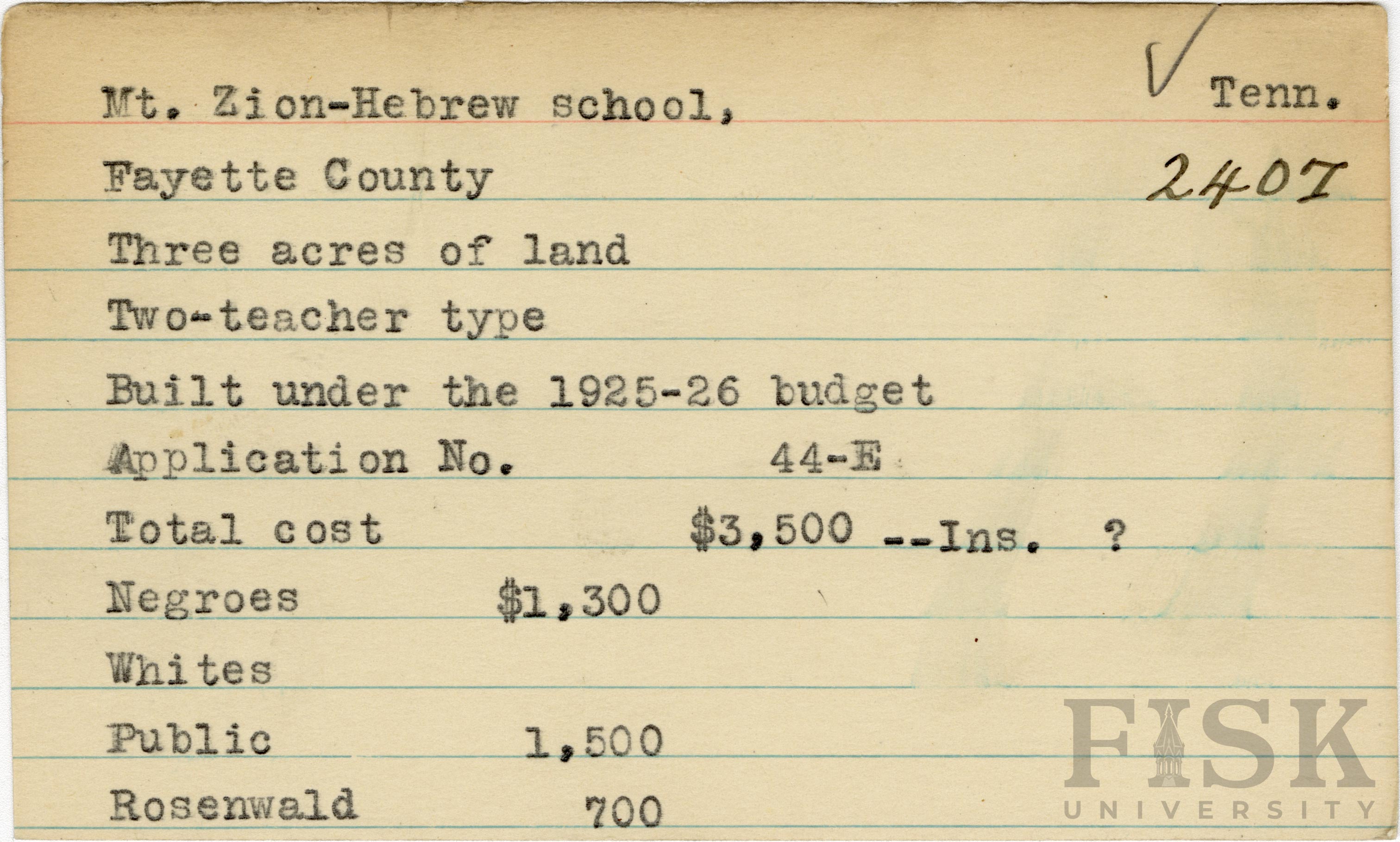 - School card from Rosenwald Fund for Mt. Zion-Hebrew School in Fayette County, Tennessee