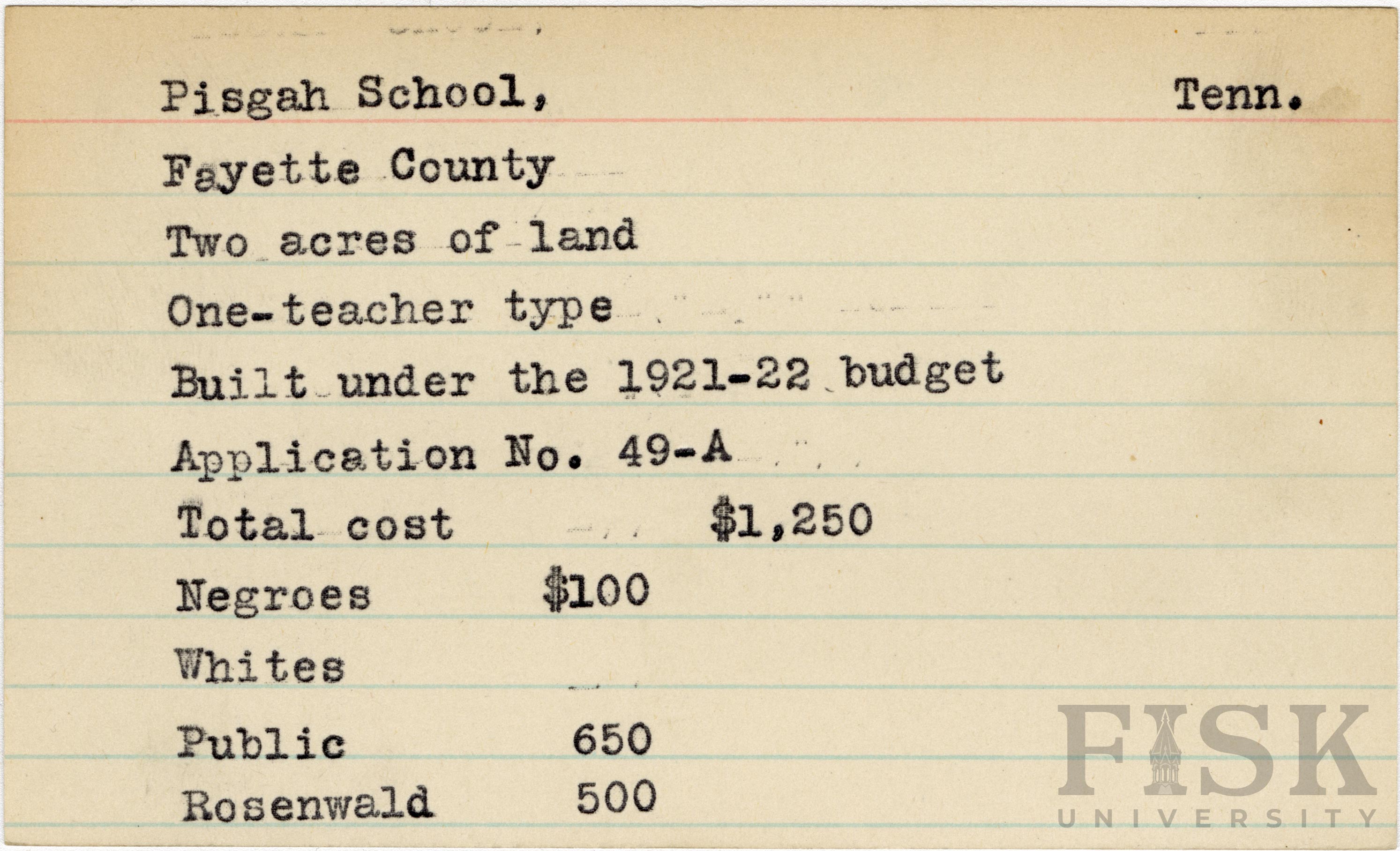 - School card from Rosenwald Fund for Pisgah School in Fayette County, Tennessee