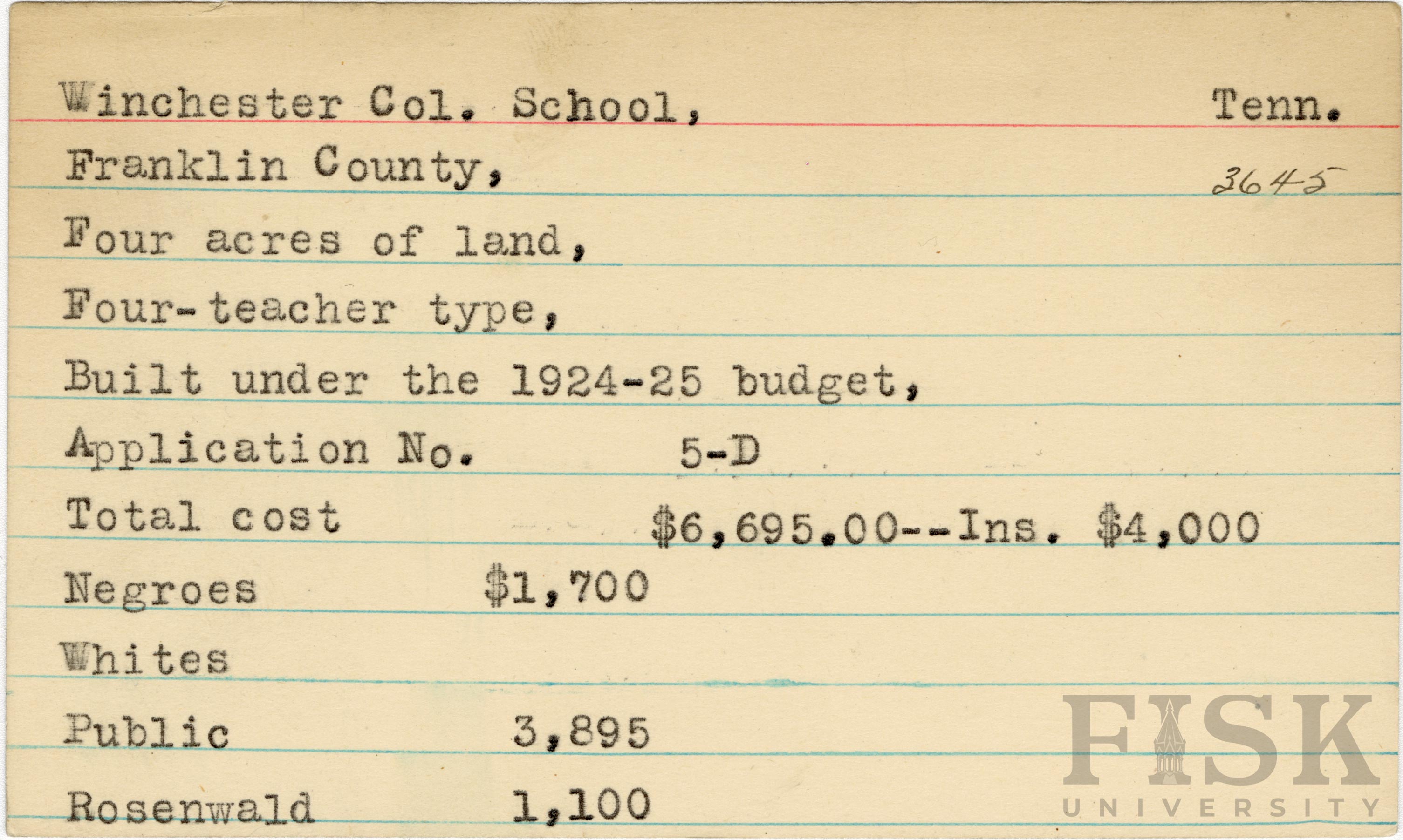 - School card from Rosenwald Fund for Winchester Col. School in Franklin County, Tennessee with a section added to the budget contributions that says, "Ins. $4,000"