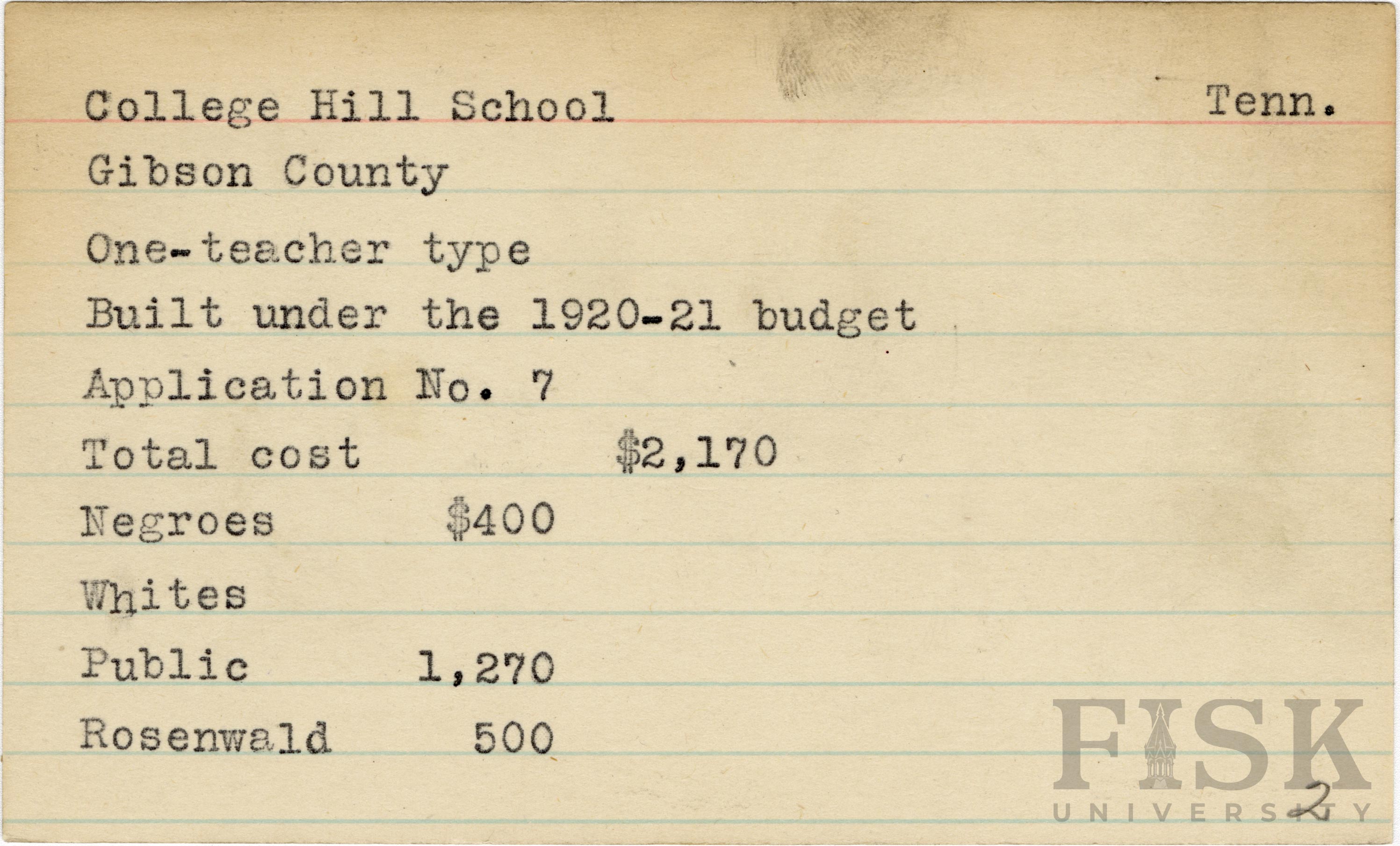 - School card from Rosenwald Fund for College Hill School in Gibson County, Tennessee