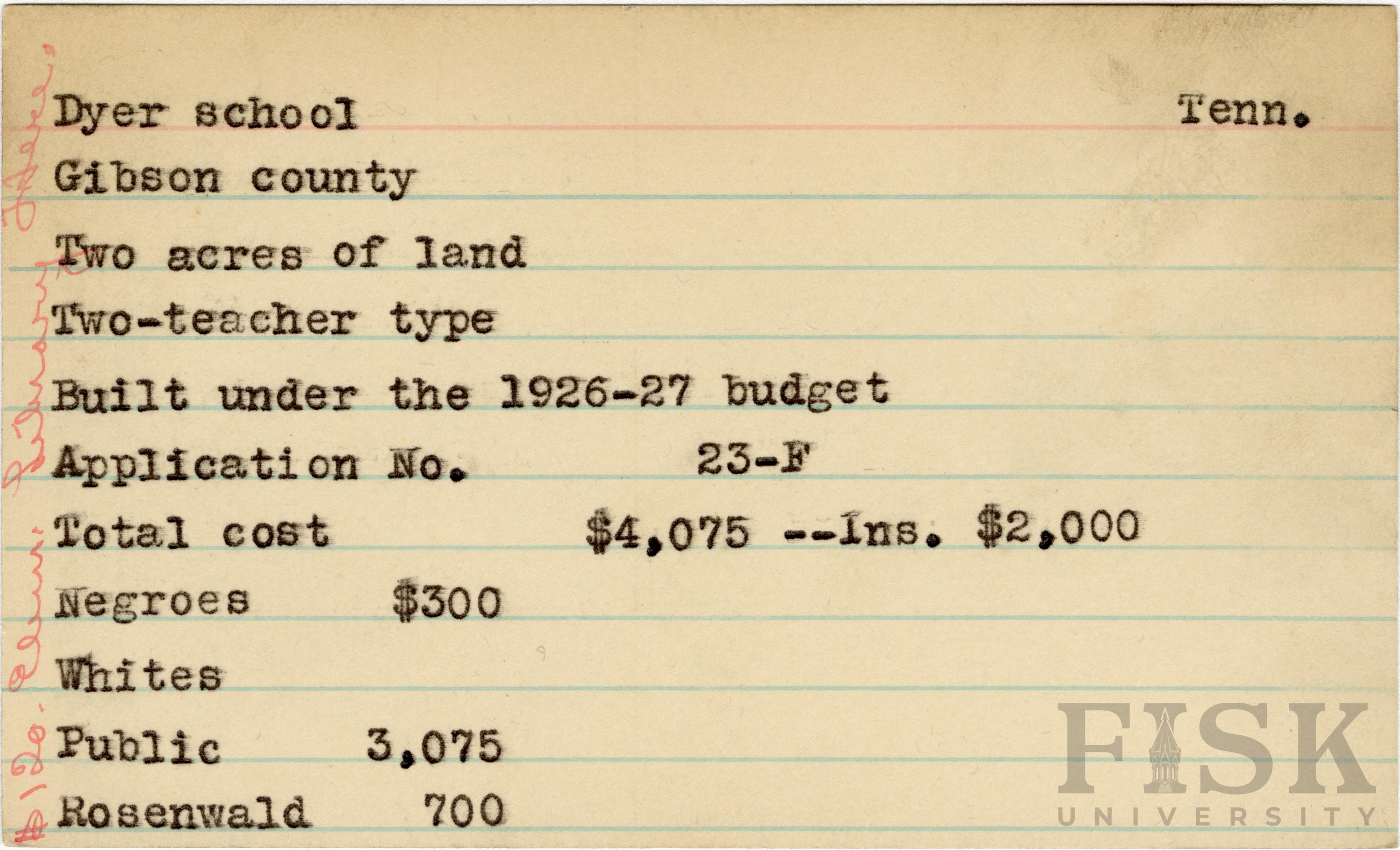 School card from Rosenwald Fund for Dyer School in Gibson County, Tennessee with a section added to the budget contributions that says, "Ins. $2,000" and a note on the card that says, "$120 elem library here"
