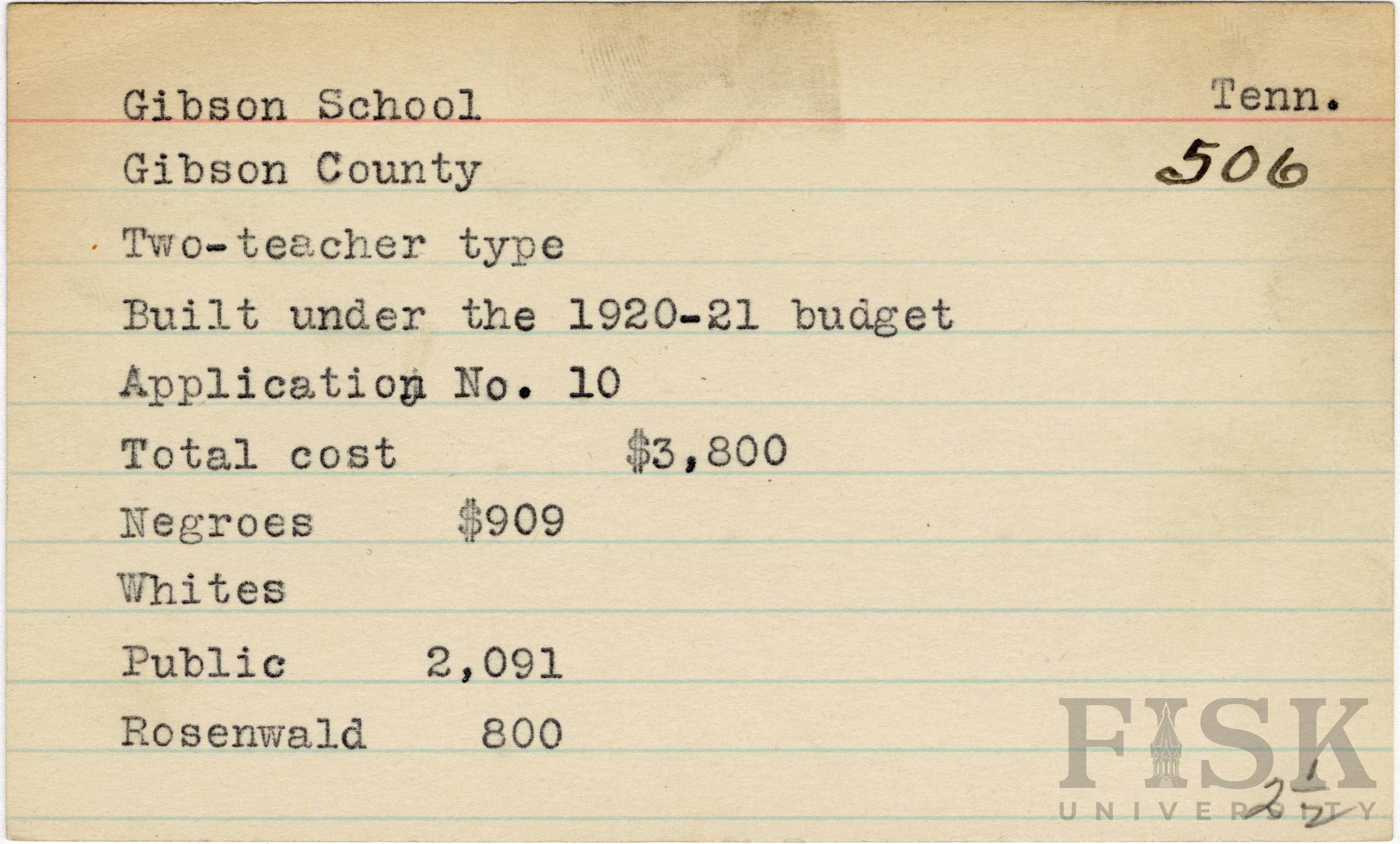 - School card from Rosenwald Fund for Gibson School in Gibson County, Tennessee