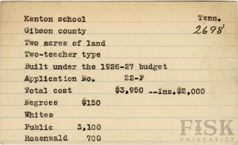 - School card from Rosenwald Fund for Kenton School in Gibson County, Tennessee with a section added to the budget contributions that says, "Ins. $2,000"