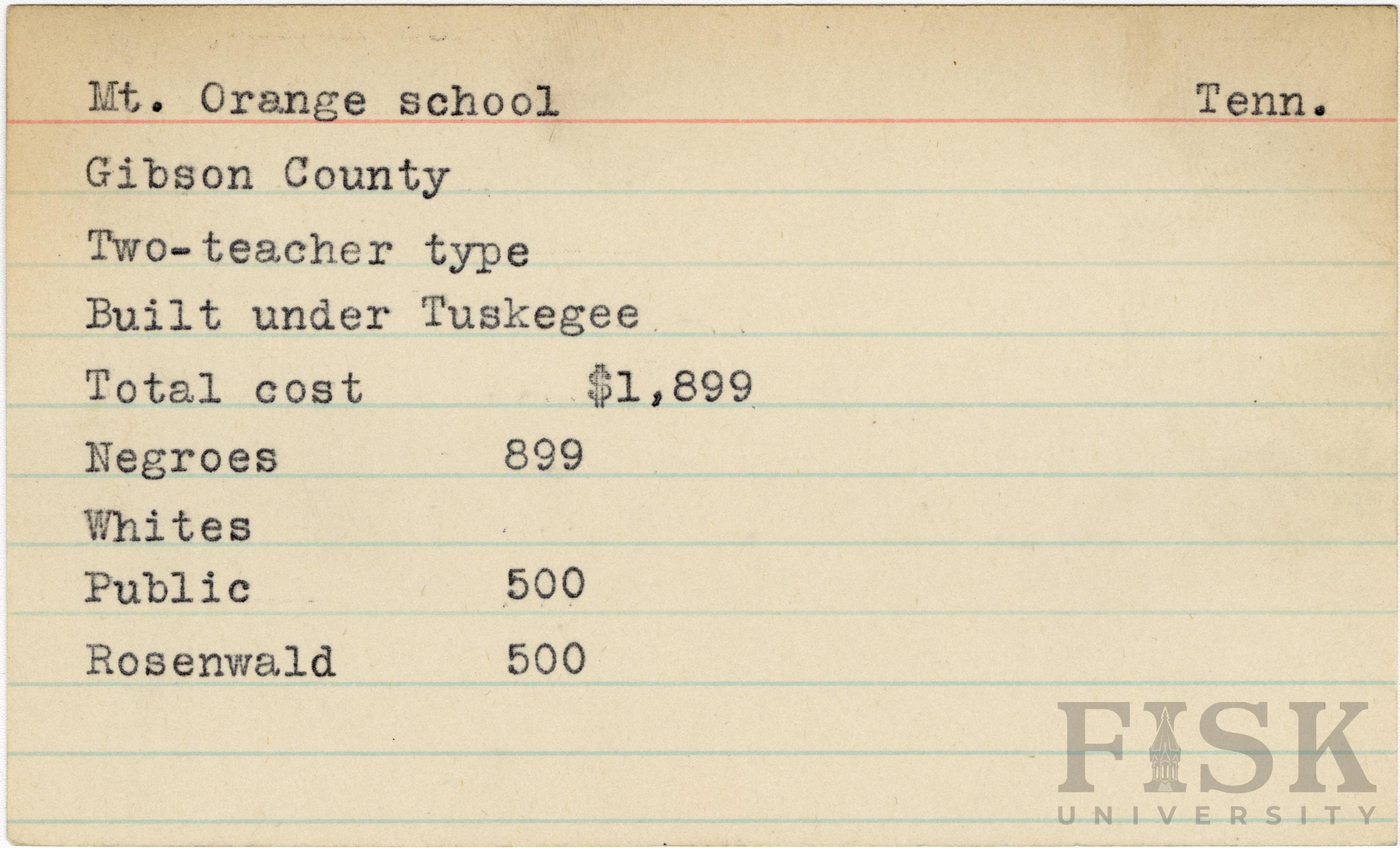 - School card from Rosenwald Fund for Mt. Orange School in Gibson County, Tennessee