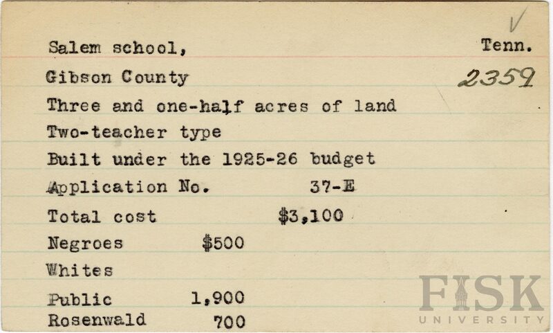 - School card from Rosenwald Fund for Salem School in Gibson County, Tennessee