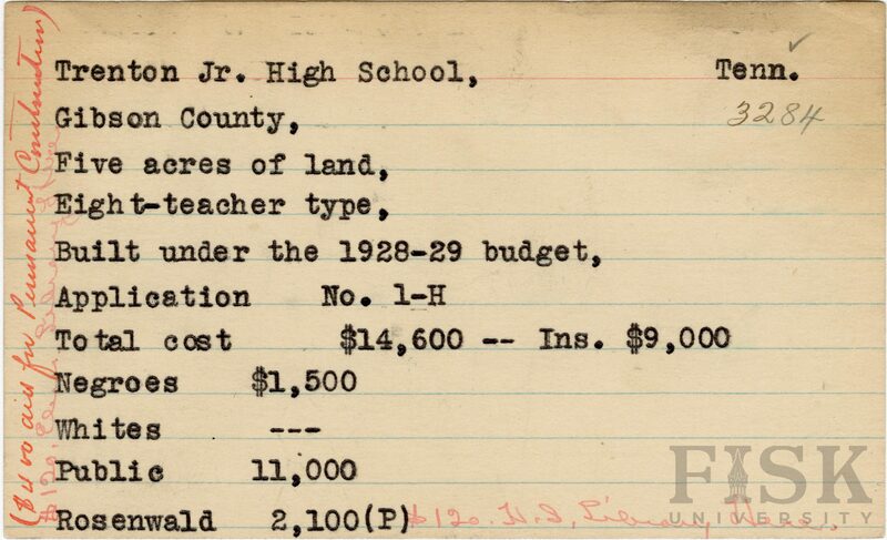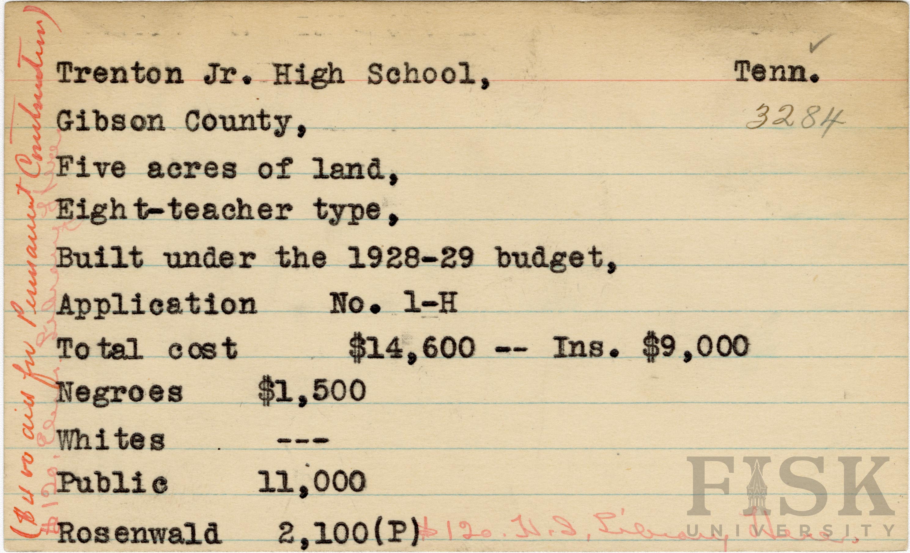 - School card from Rosenwald Fund for Trenton Jr. High School in Gibson County, Tennessee with a section added to the budget contributions that says, "Ins. $9,000". Notes on the card say, "($400 aid for permanent construction)," "$120 elem library here," and "$120 H.S. library here"