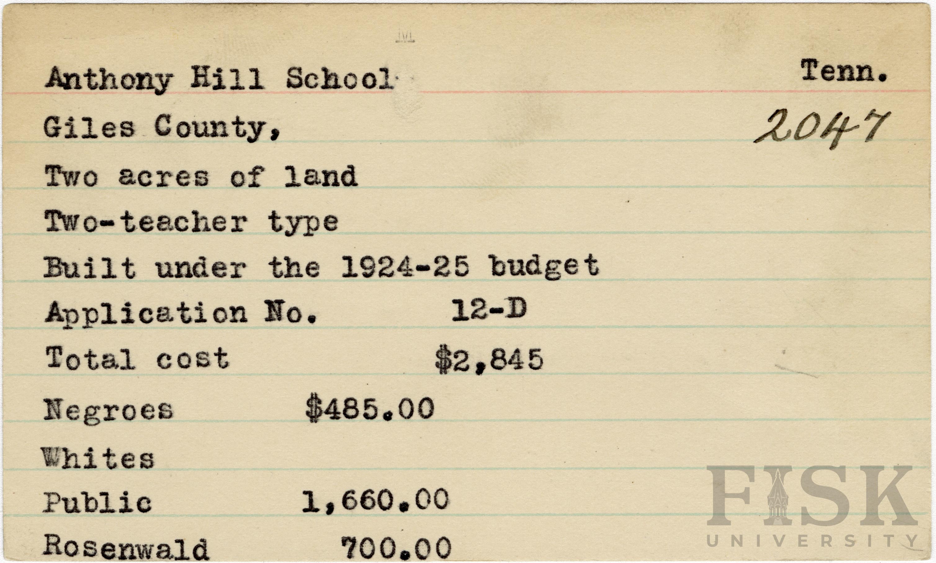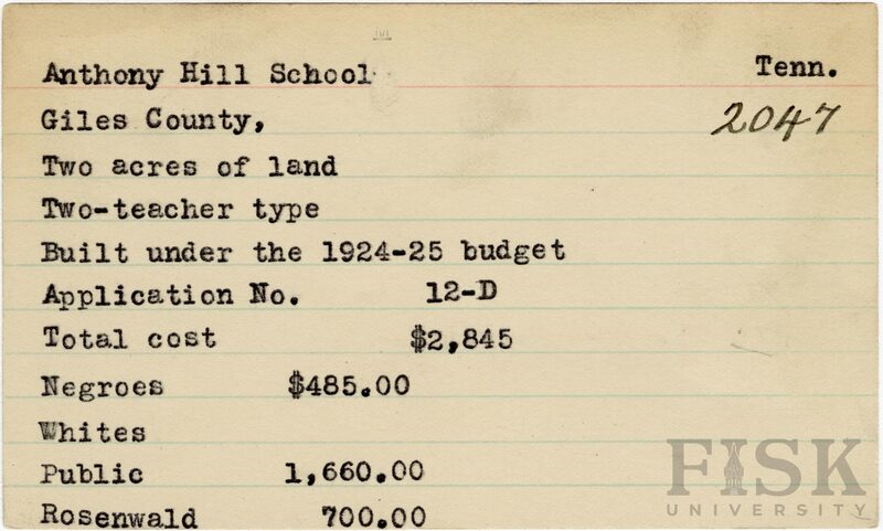 - School card from Rosenwald Fund for Anthony Hill School in Giles County, Tennessee