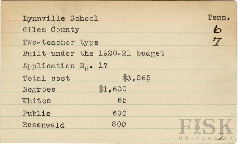 - School card from Rosenwald Fund for Lynnville School in Giles County, Tennessee